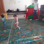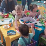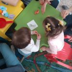 На прошлой неделе на занятиях в детской студии «Развиваемся, играя» ребята подружились с семейством зайчат. Строили домики, лепили горошек, играли с мячиками. Бегали по волшебной дорожке и танцевали с цветочками. А ещё приготовили для зайчат вкусный обед. На память сделали аппликацию «Домик для зайчат».