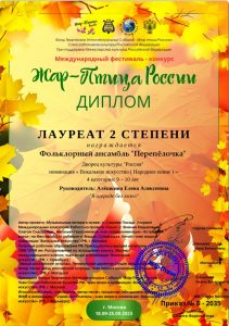 Фольклорный ансамбль “Перепелочка” под руководством Алешкиной Елены Алексеевны приняли участие в Международном фестивале-конкурсе «Жар-птица России». Но на этот раз ансамбль стал Лауреатом II степени в номинации “Вокальное искусство. Народное пение”, возрастная категория 9-10 лет.