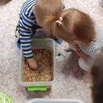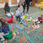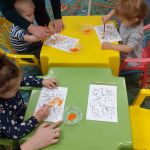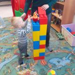 Сегодня в детской студии «Развиваемся, играя» детки познакомились с петушком. Накормили зернышками и построили высокий дом. Затем собрали друзей (ослика и дракончика) и сделали салат и компот.