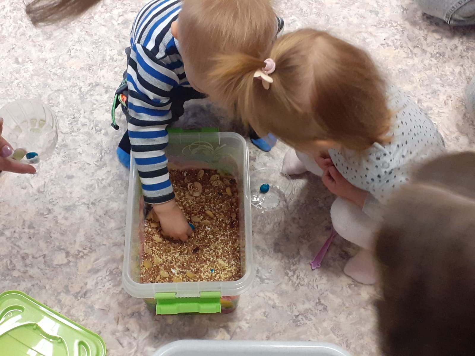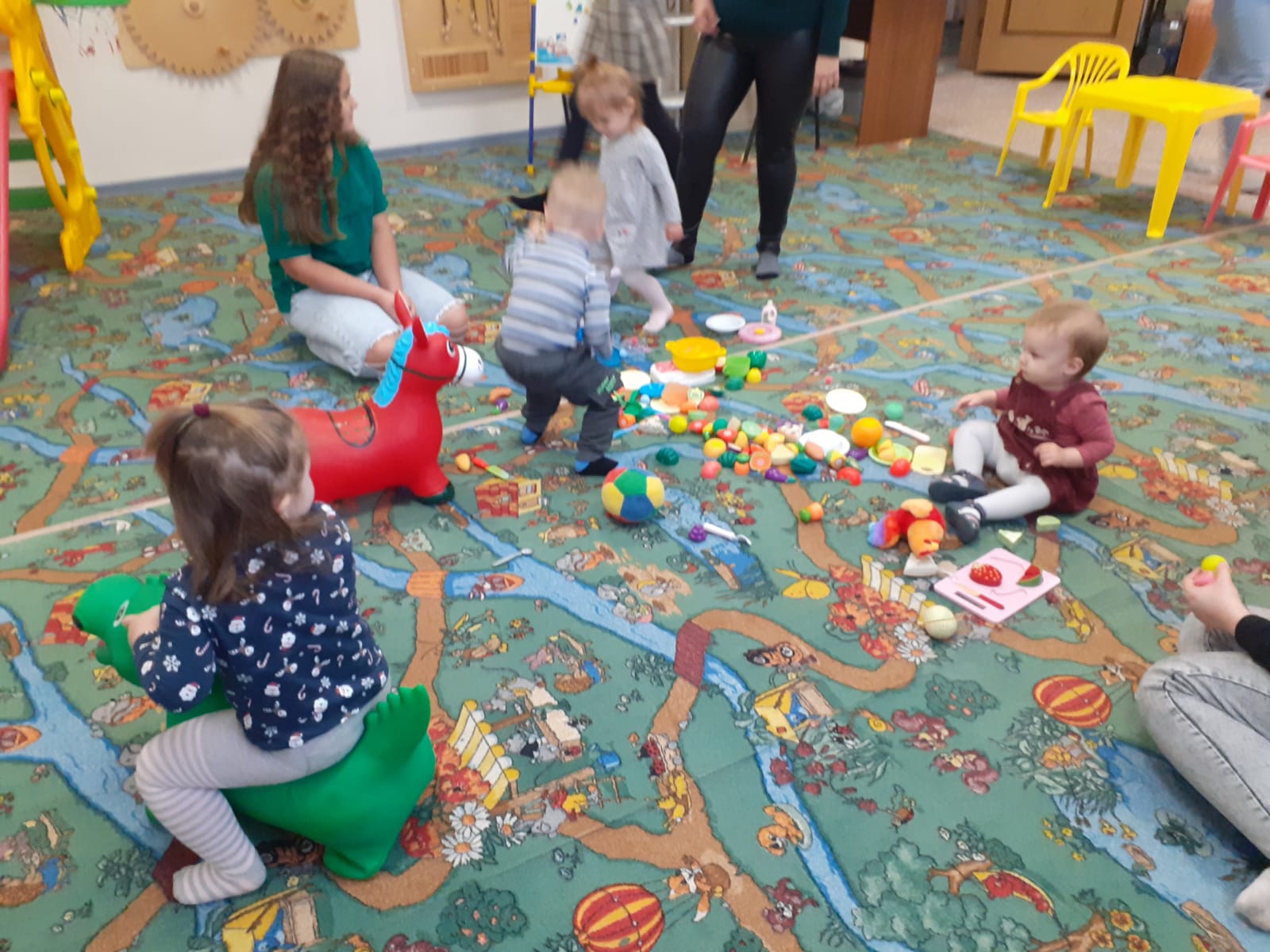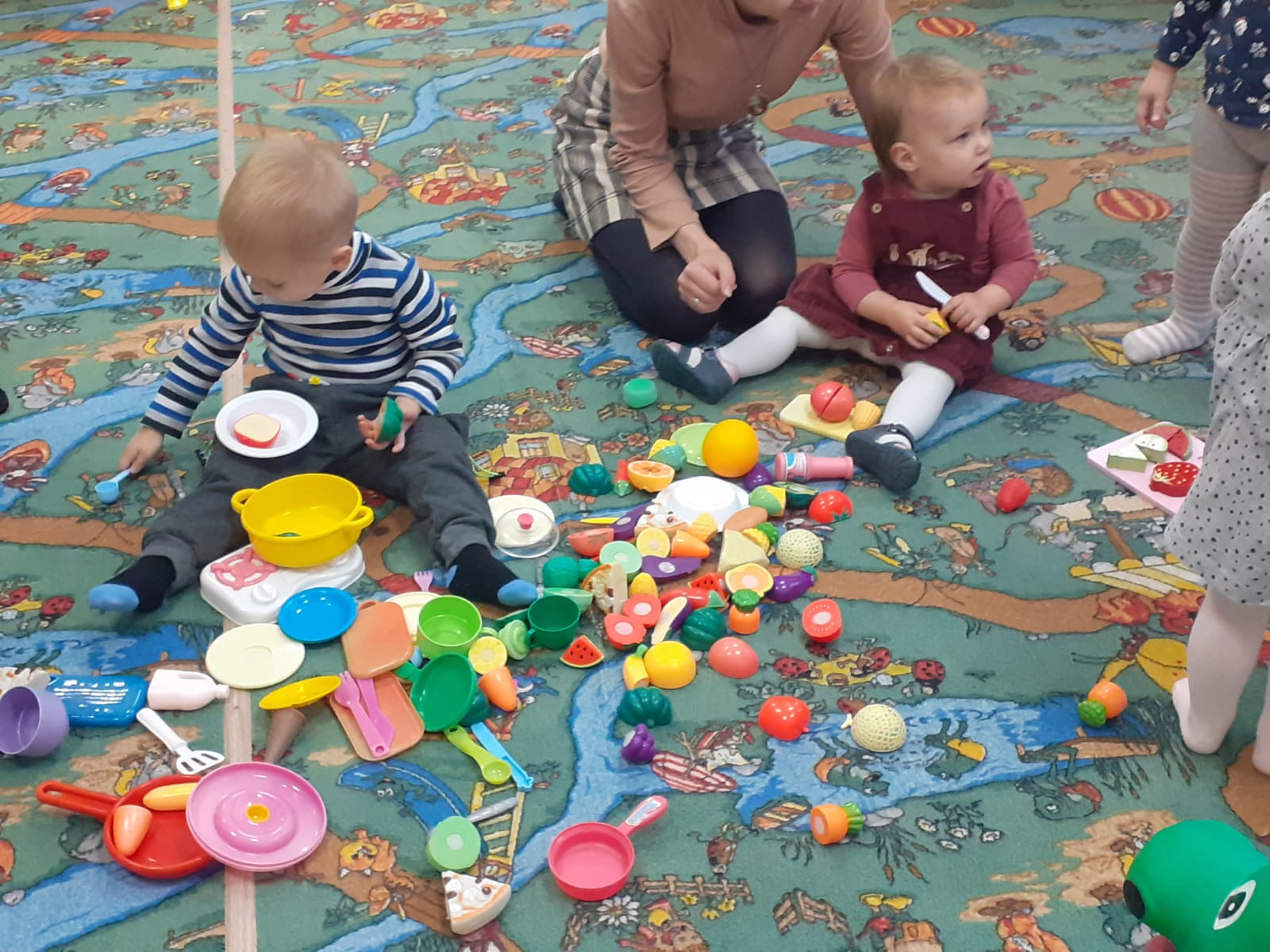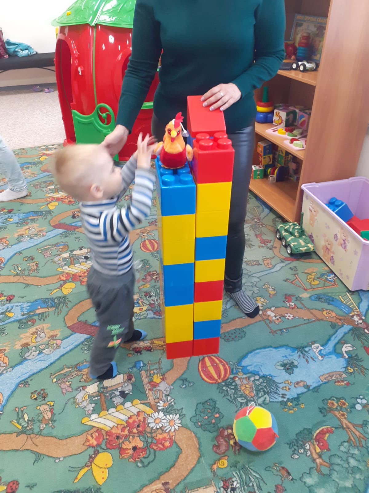 Сегодня в детской студии «Развиваемся, играя» детки познакомились с петушком. Накормили зернышками и построили высокий дом. Затем собрали друзей (ослика и дракончика) и сделали салат и компот.