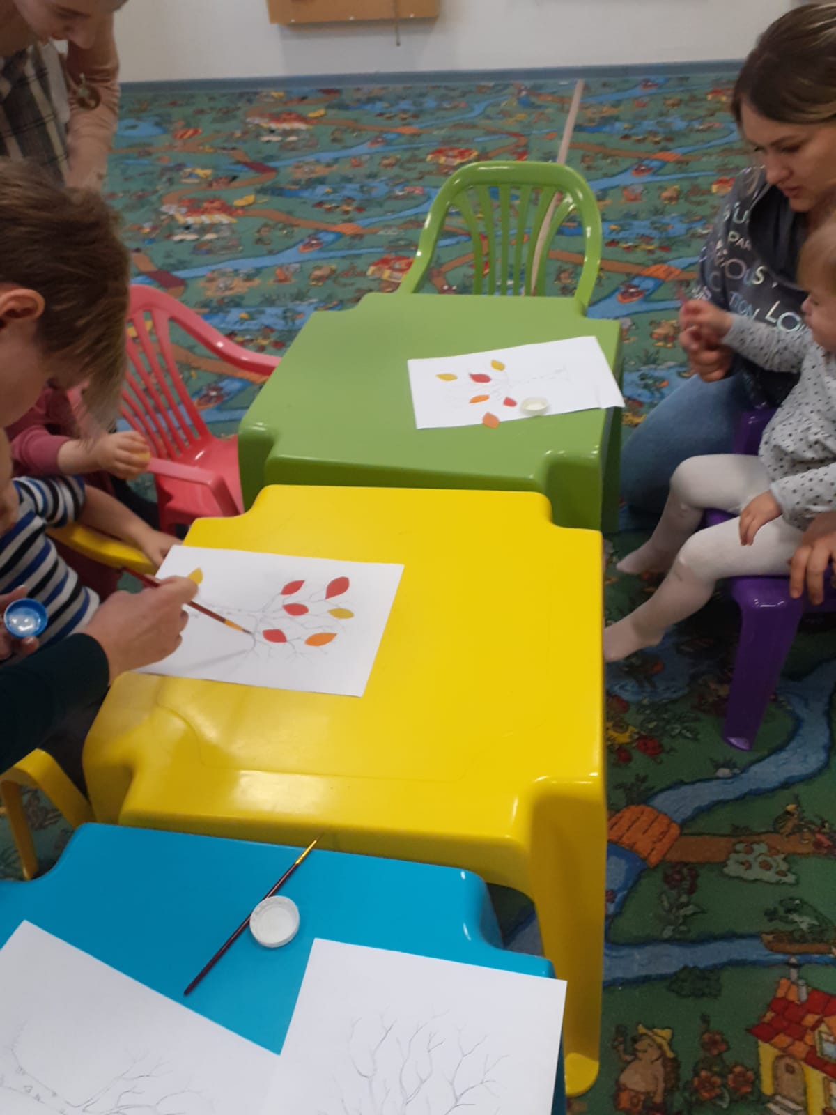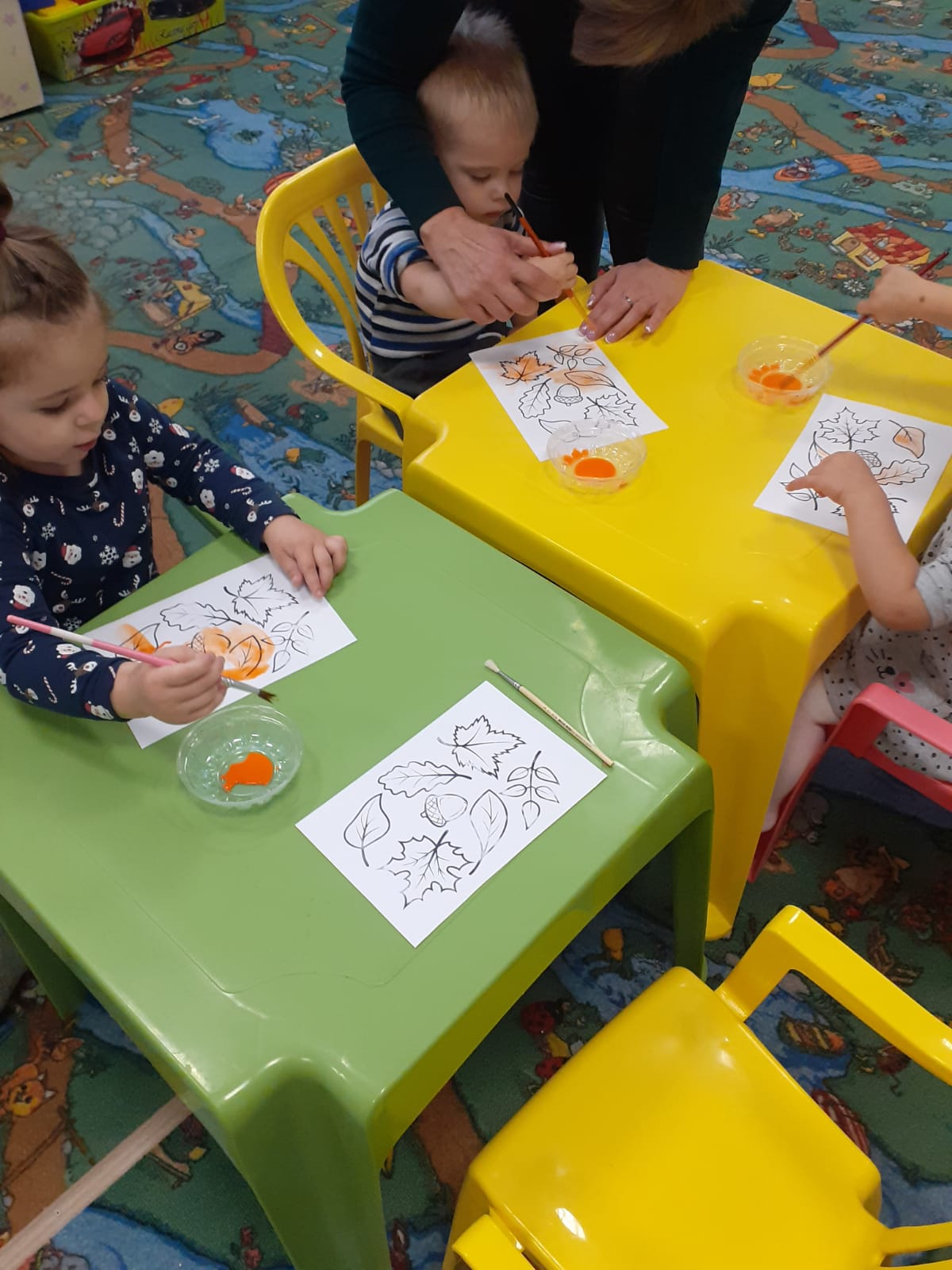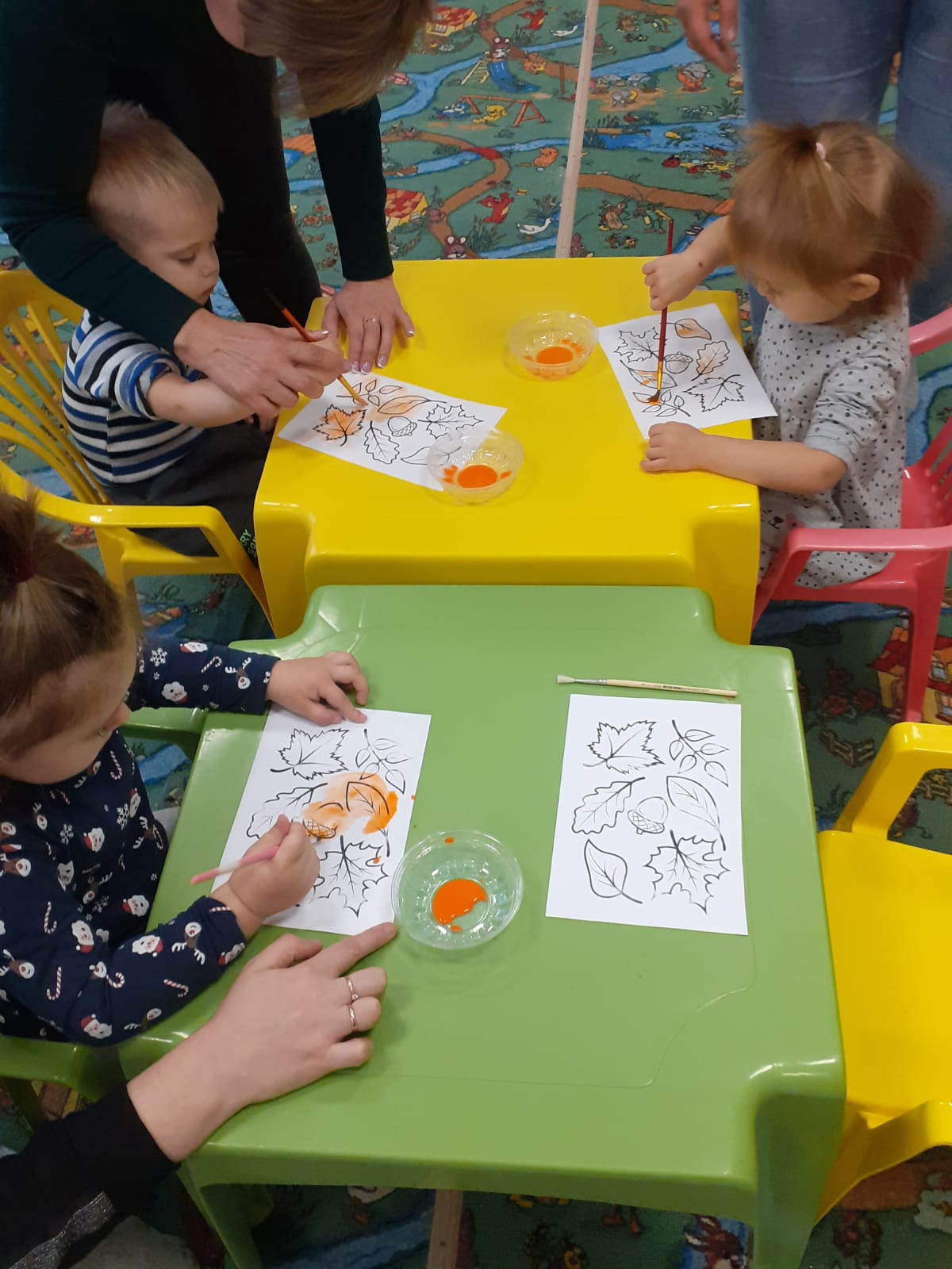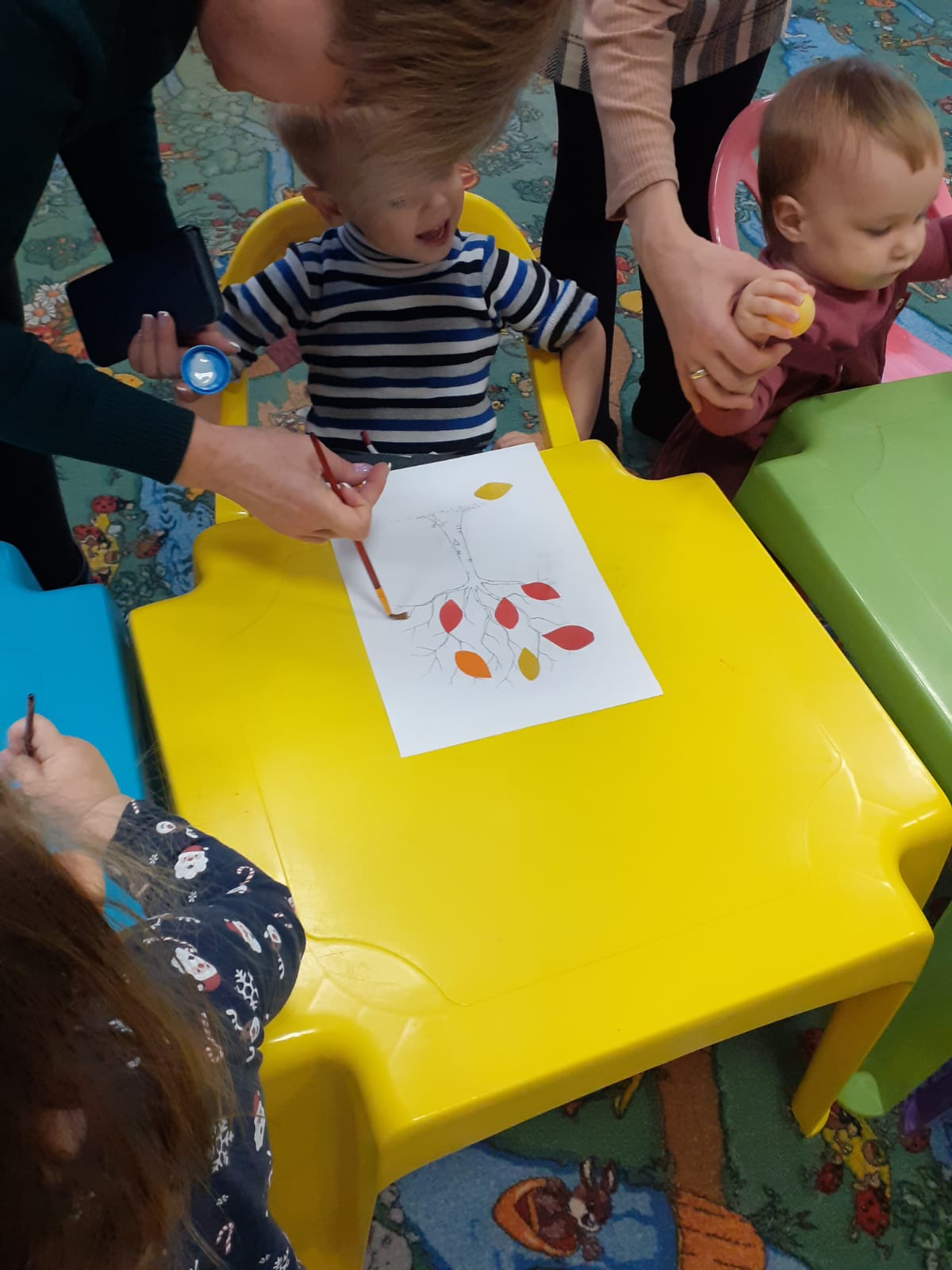 Потом отправились в лес под музыкальную паузу «Паровозик». Раскрасили осенние листья и отыскали потерянные камушки.
