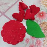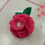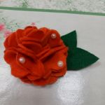 Цветок из фетра делается тоже несложно, вырезаются лепестки и листочки, сшиваются или склеиваются и прикрепляются к металлической плашке с булавкой. На лепестки можно приклеить различные украшения в виде бусинок или блесток.