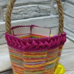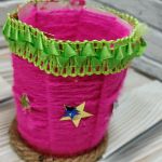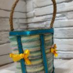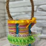 Сначала нужно подготовить пластиковый стаканчик для такой поделки. Для этого нам потребуются ножницы. Разрезаем боковую часть стаканчика на полоски. Важно, чтобы их количество было нечетным. Затем начинаем обматывать пряжей наш стаканчик снизу вверх. По окончании работы корзинку можно украсить декоративными элементами.