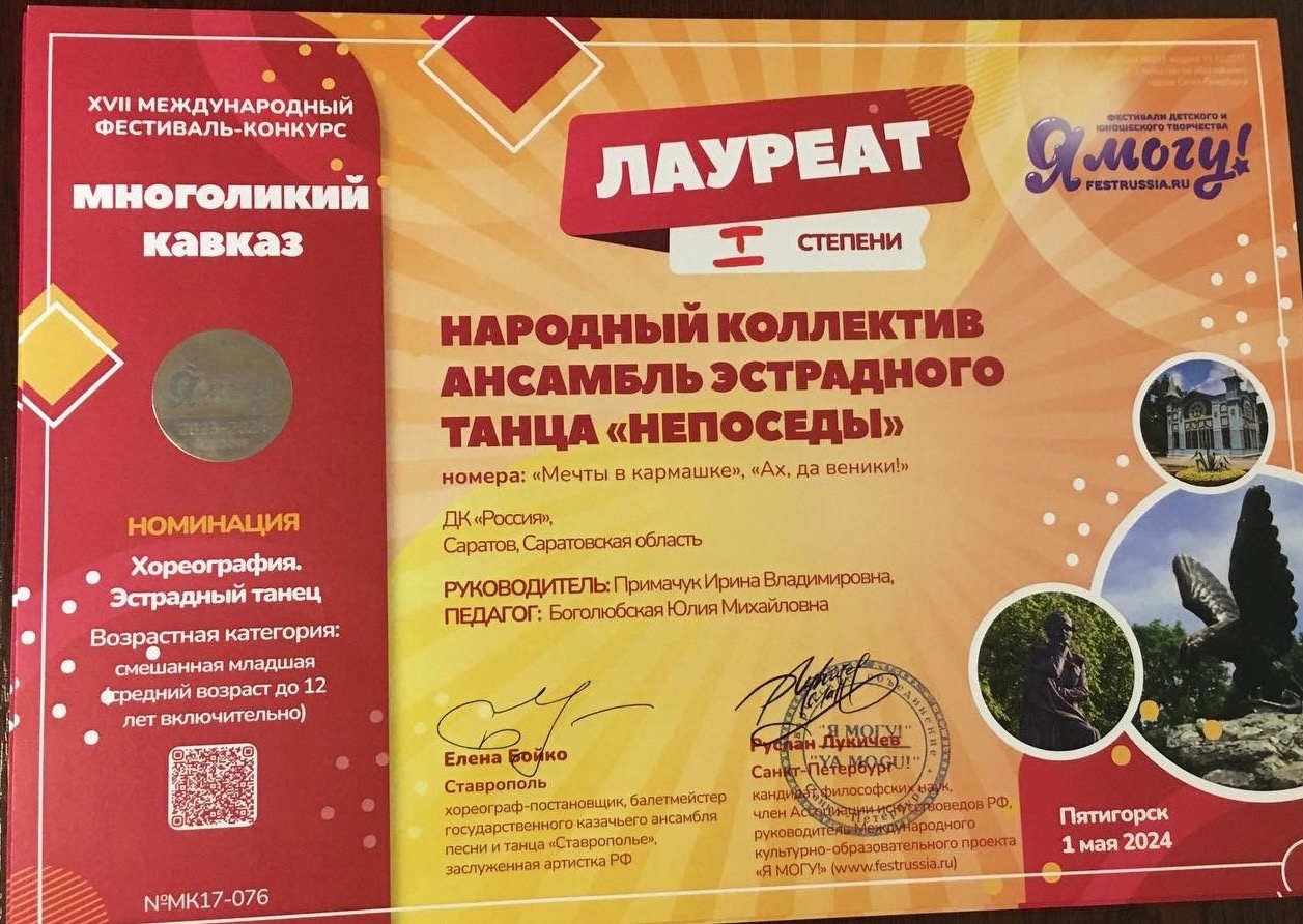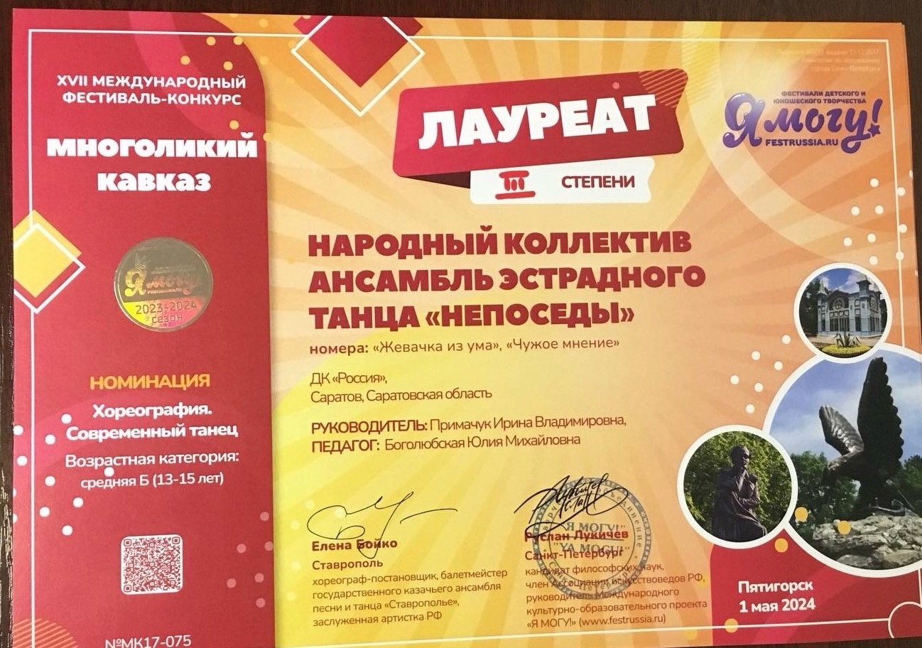 1 мая 2024 года в Пятигорске прошел XVII МЕЖДУНАРОДНЫЙ ФЕСТИВАЛЬ-КОНКУРС «МНОГОЛИКИЙ КАВКАЗ», где блистал “Народный коллектив” ансамбль эстрадного танца «Непоседы»!