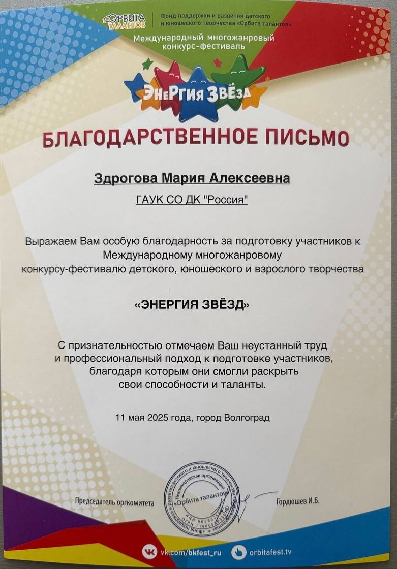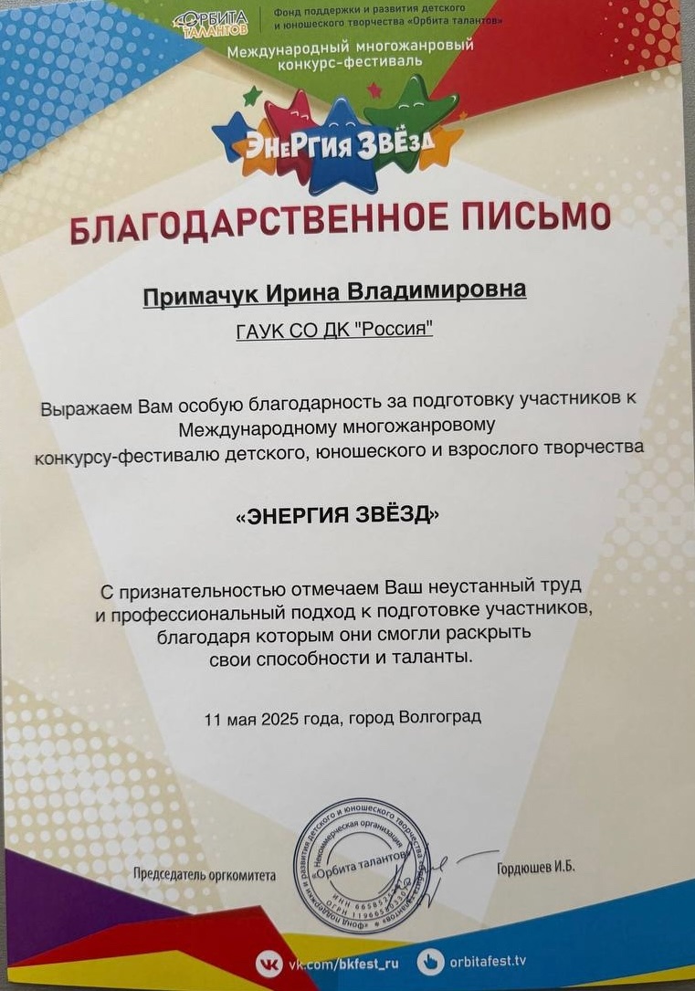 11 мая 2025 года «Народный коллектив» ансамбль эстрадного танца «Непоседы» под руководством Ирины Владимировны Примачук достойно представил Саратов на Международном конкурсе-фестивале «Энергия Звёзд» в городе Волгограде. Профессиональное жюри высоко оценило выступление коллектива:
