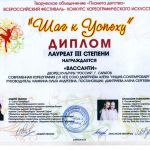 Участница народного коллектива Ансамбля восточного танца «Васанти» Дмитриева Алена за авторский танец завоевала звание лауреата третьей степени на ВСЕРОССИЙСКОМ ФЕСТИВАЛЕ – КОНКУРСЕ ХОРЕОГРАФИЧЕСКОГО ИСКУССТВА «ШАГ К УСПЕХУ», организатор фестиваля — Творческое объединение «Планета детства».