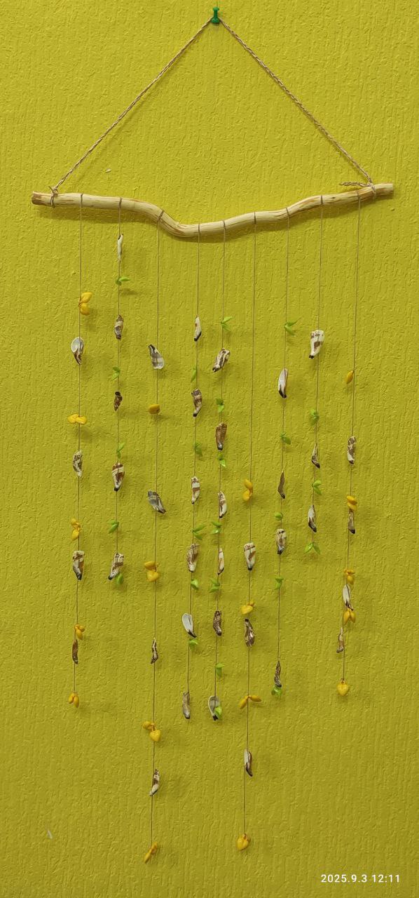 И вот оно, волшебство — под лёгким дуновением ветра конструкция оживает. Тонкие нити танцуют, ракушки тихо позванивают, словно бубенцы, а деревянные элементы плавно кружатся в воздушном вальсе. Это не просто поделка — это оригинальное украшение интерьера, наполненное теплом рук и искренней радостью творчества.