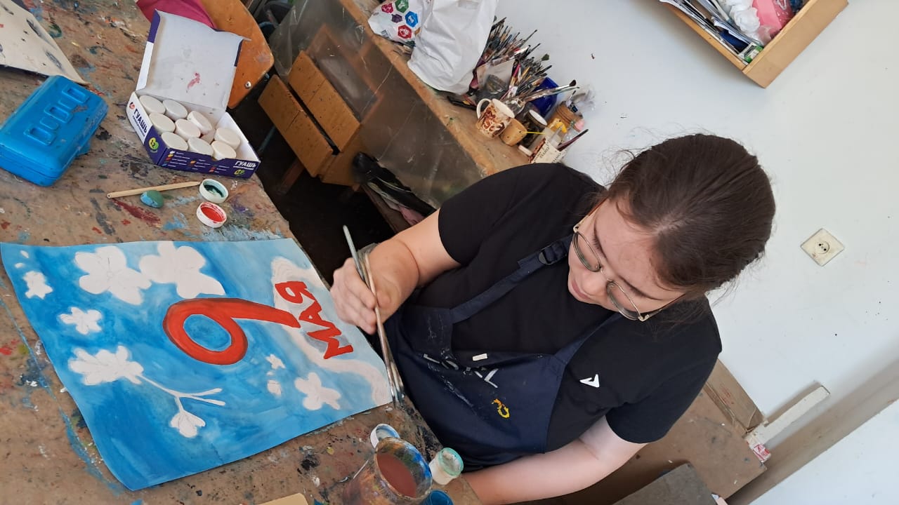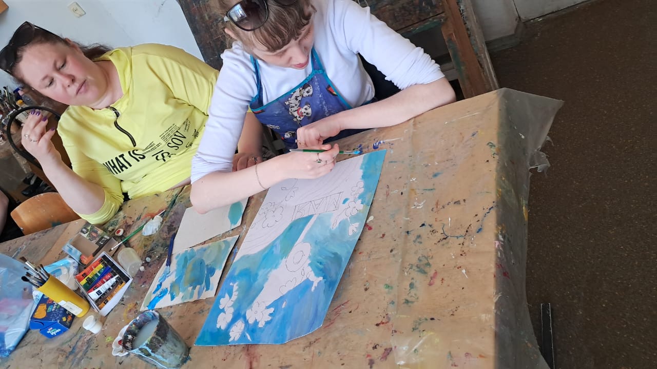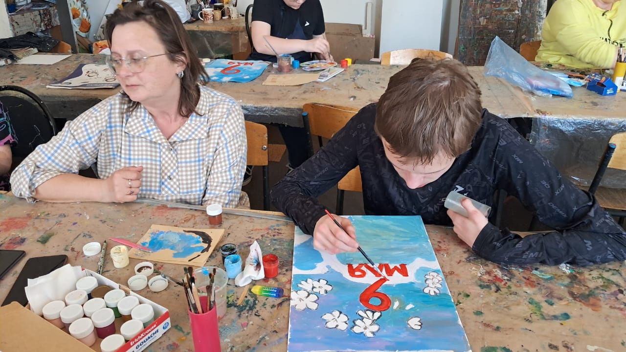 На занятиях ИЗО участники инклюзивной творческой лаборатории «Дорога к счастью» рисовали открытки ко Дню Победы — 9 Мая.