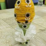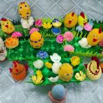 Каждое яйцо украшали вязаной крючком цепочкой из воздушных петель и украшали цветочками из салфеток и лотков от яиц. Завершающий штрих — добавление стразов, которые придали поделкам особую яркость и красоту. Получилось очень красиво.