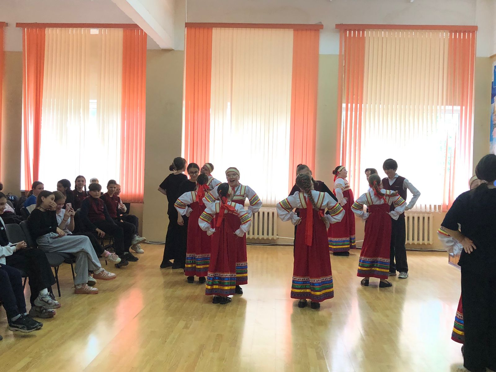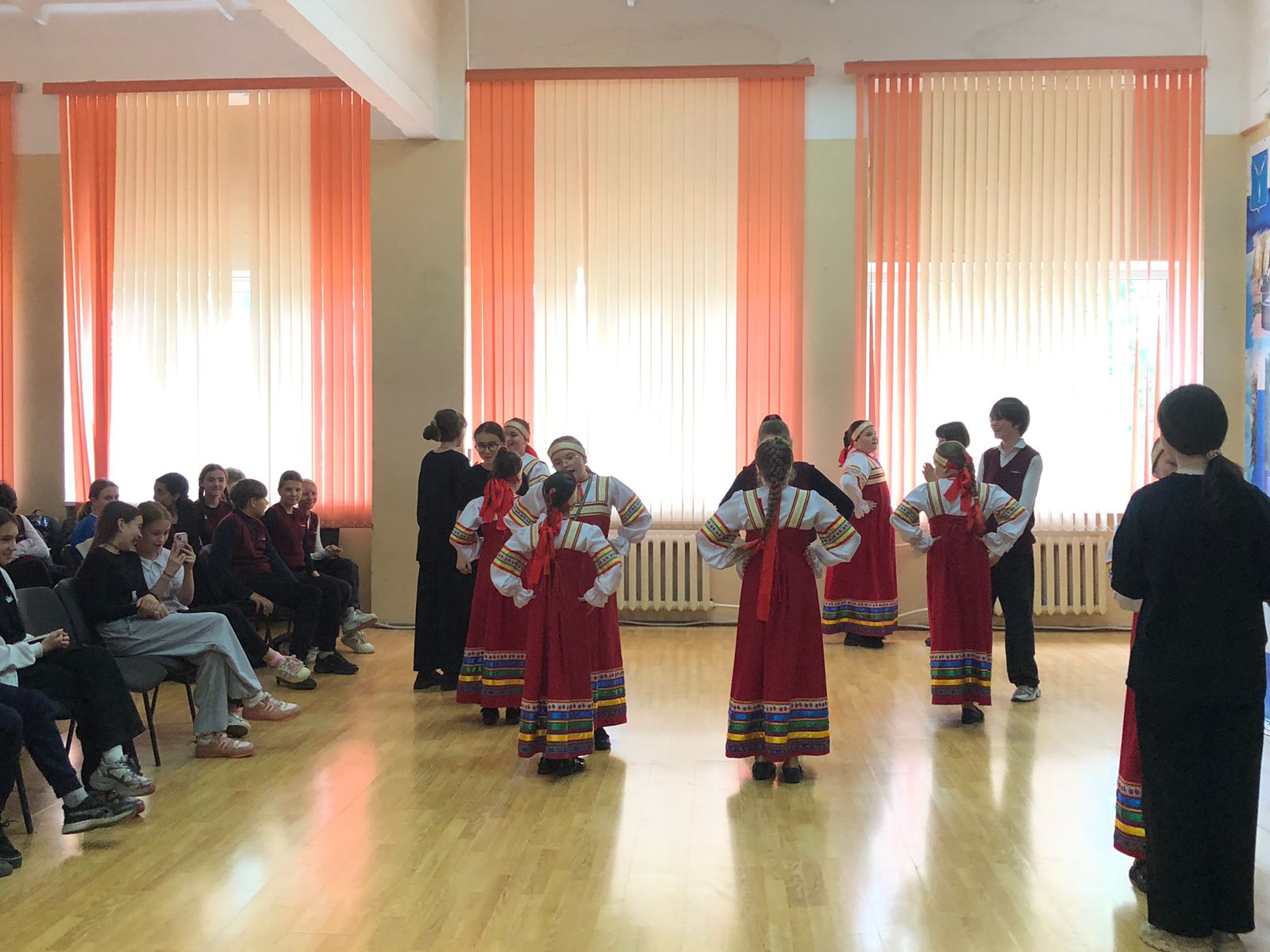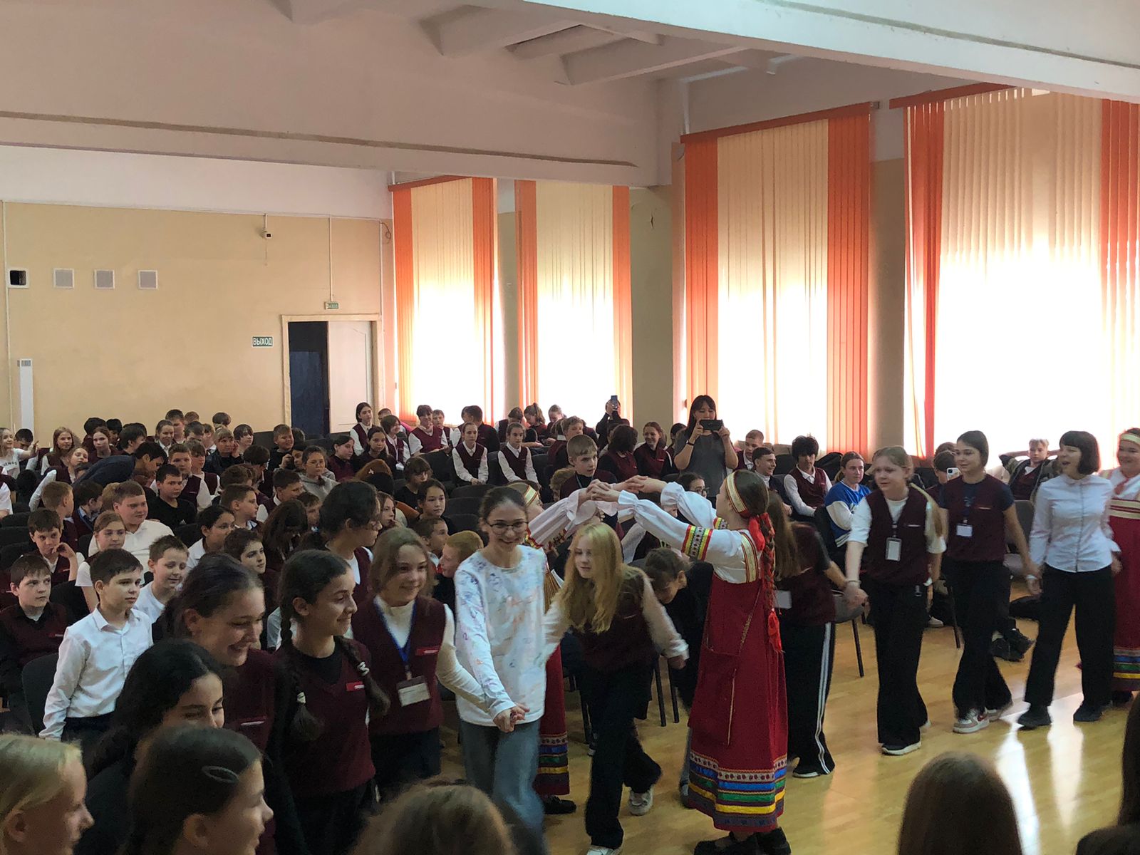 На сцене звучали русские народные песни, весёлые частушки, а также композиции, посвящённые традиционным обрядовым праздникам. Выступление стало не просто концертом, а настоящим знакомством с живым народным наследием: школьники увидели, как через песню и игру передаются культура, история и уклад жизни предков.
