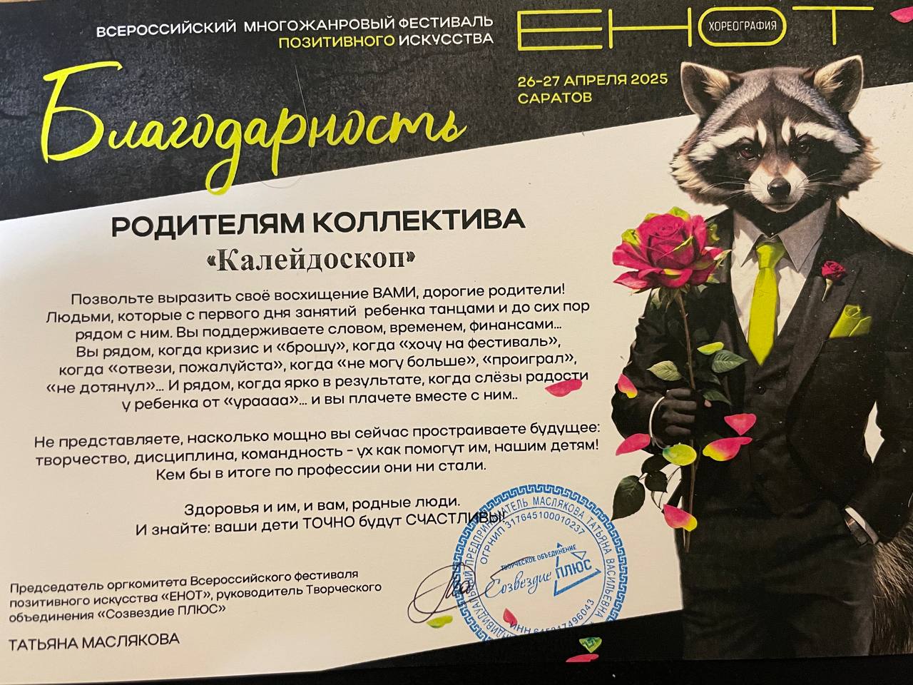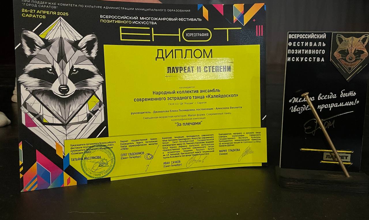 27 апреля 2025 года «Народный коллектив» ансамбль современного эстрадного танца «Калейдоскоп» принял участие во Всероссийском многожанровом фестивале позитивного искусства «Енот» и вновь подтвердил свой высокий уровень.