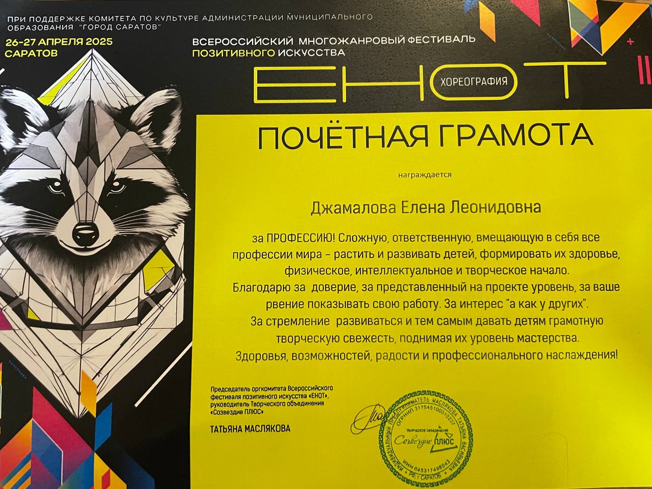 - Руководитель коллектива Джамалова Елена Леонидовна удостоена Почётной грамоты за профессиональное мастерство и вклад в развитие хореографического искусства.