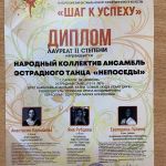 12 марта состоялся IV Всероссийский фестиваль-конкурс хореографического искусства «Шаг к успеху» в котором принял участие «Народный коллектив» ансамбль эстрадного танца «Непоседы» Дворца культуры «Россия» под руководством Примачук Ирины Владимировны и получил высшие награды.
