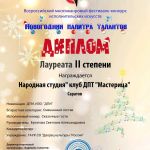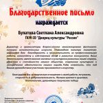 И неудивительно, что за этот коллективный труд коллектив был удостоен Лауреата II степени во Всероссийском многожанровом фестивале-конкурсе исполнительских искусств «Новогодняя Палитра Талантов». А Светлане Александровне вручили Благодарственное письмо. Это признание высокого профессионализма и творческого потенциала коллектива.