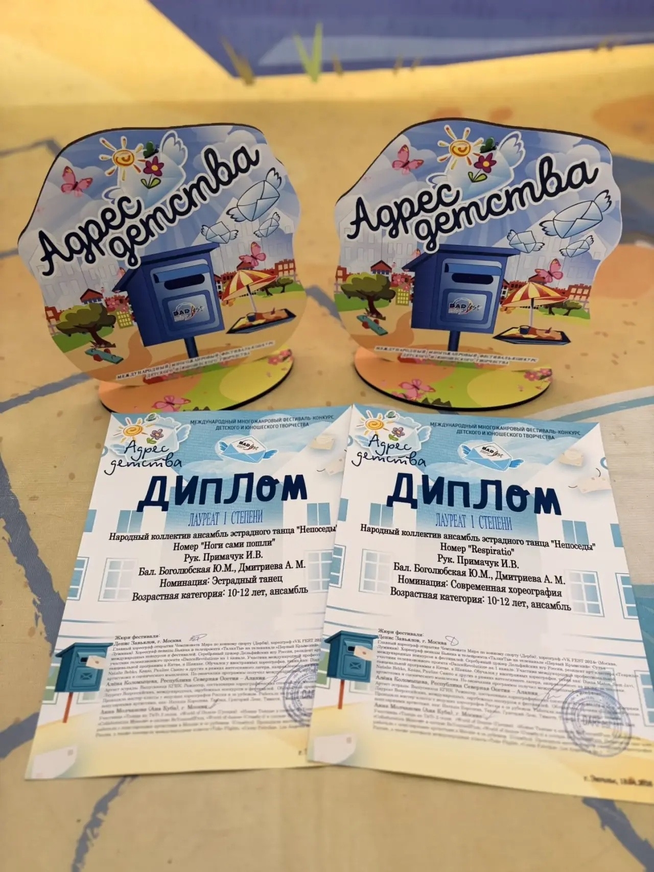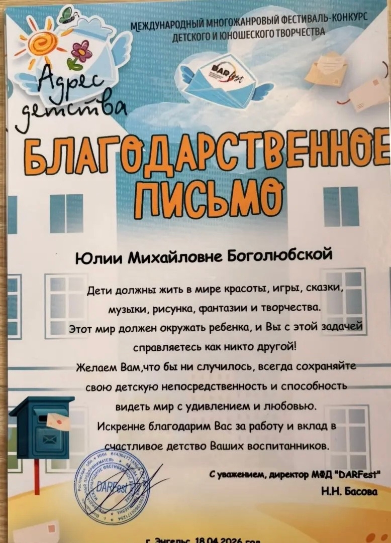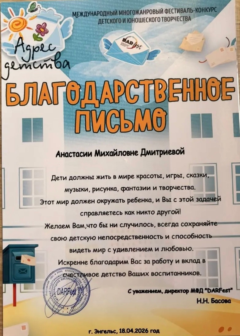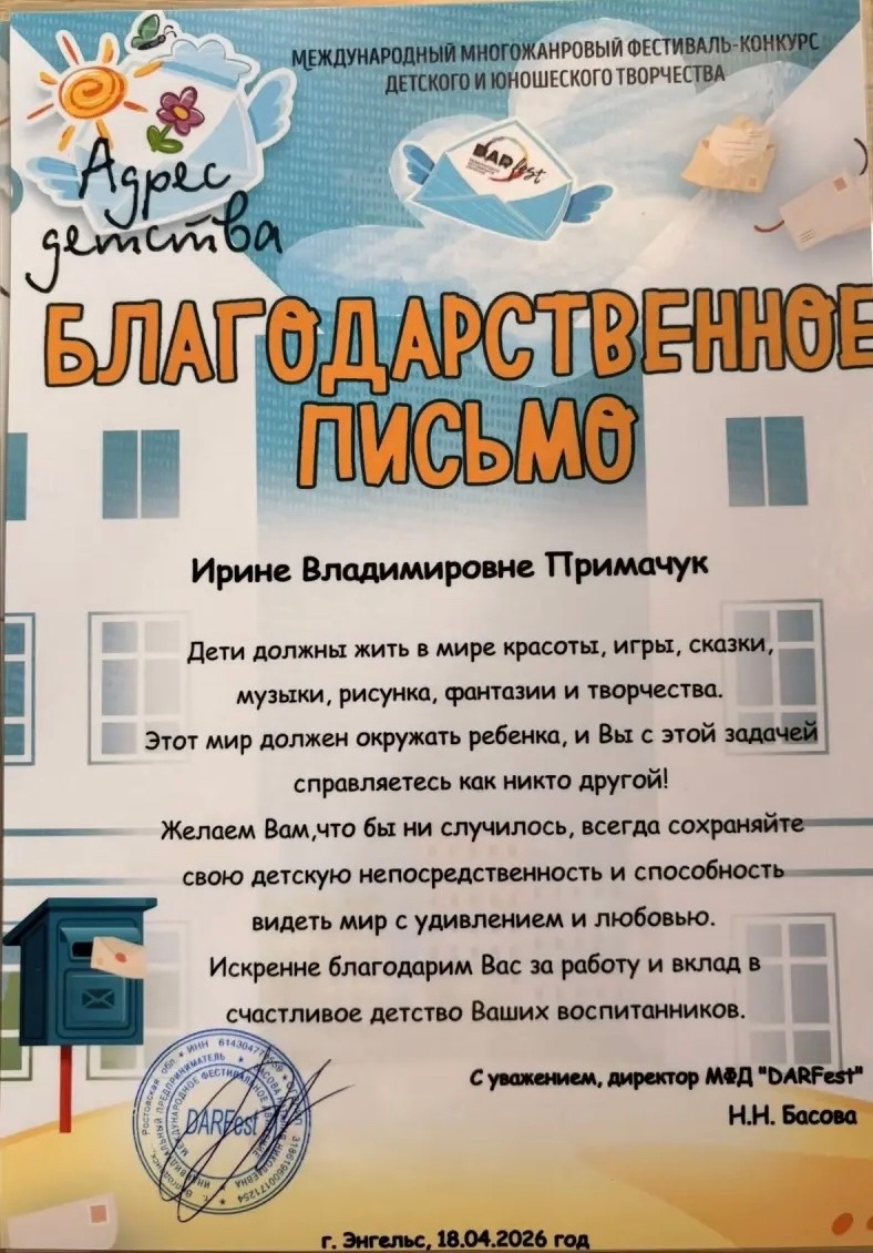 Руководитель Ирина Владимировна Примачук, а также балетмейстеры Юлия Михайловна Боголюбская и Анастасия Михайловна Дмитриева получили благодарственные письма. За работу, за терпение, за тот негромкий вклад в счастливое детство, который видно только тогда, когда твои воспитанники выходят на сцену и — побеждают.