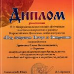 Поздравляем народный коллектив фольклорно-этнографический ансамбль «Собор» под руководством Лукониной Елены Валентиновны с победой во II-ом межрегиональном онлайн-фестивале семейного творчества в рамках Всероссийского Дня семьи, любви и верности «Под покровом Петра и Февронии» город Ейск.