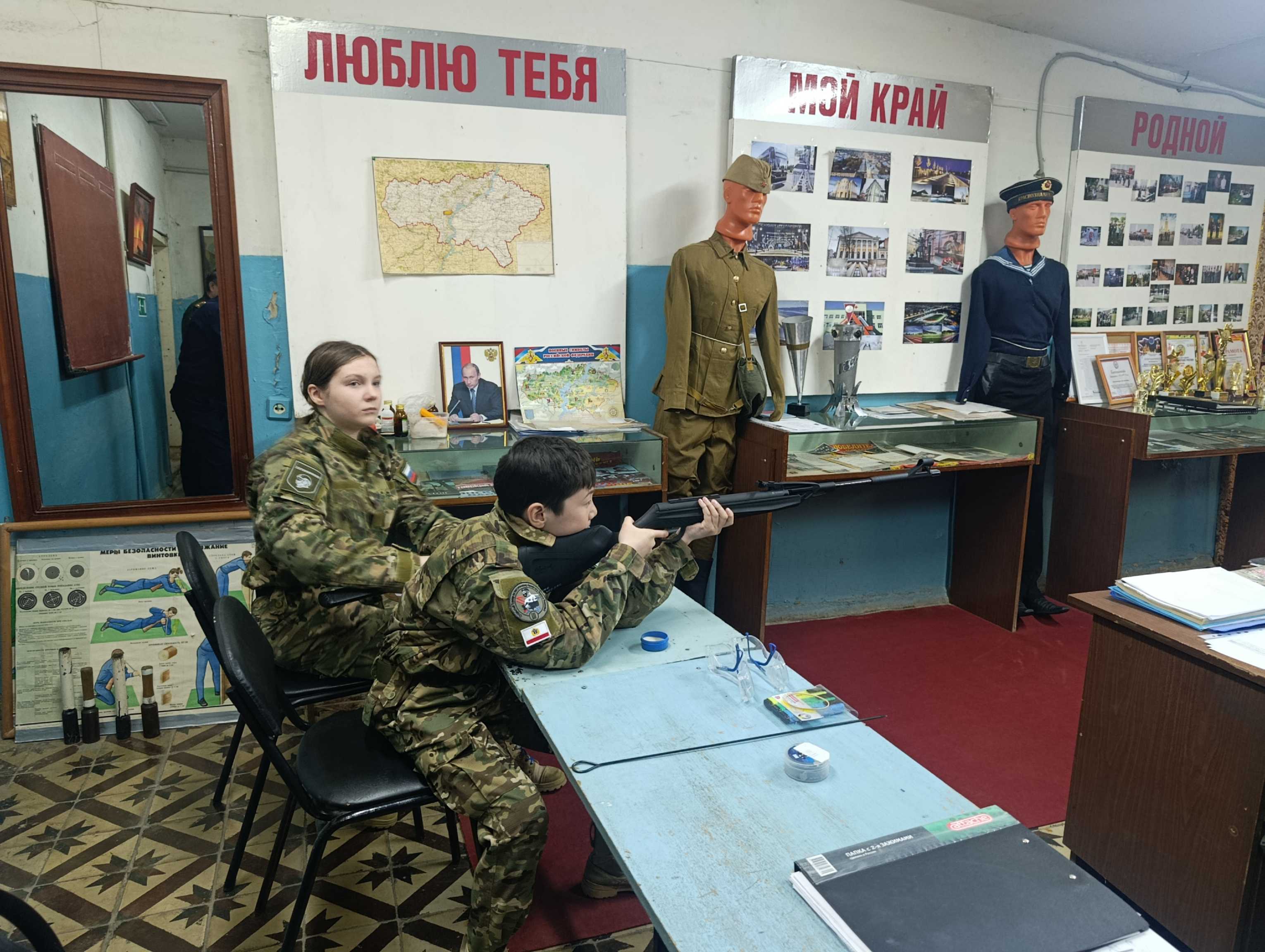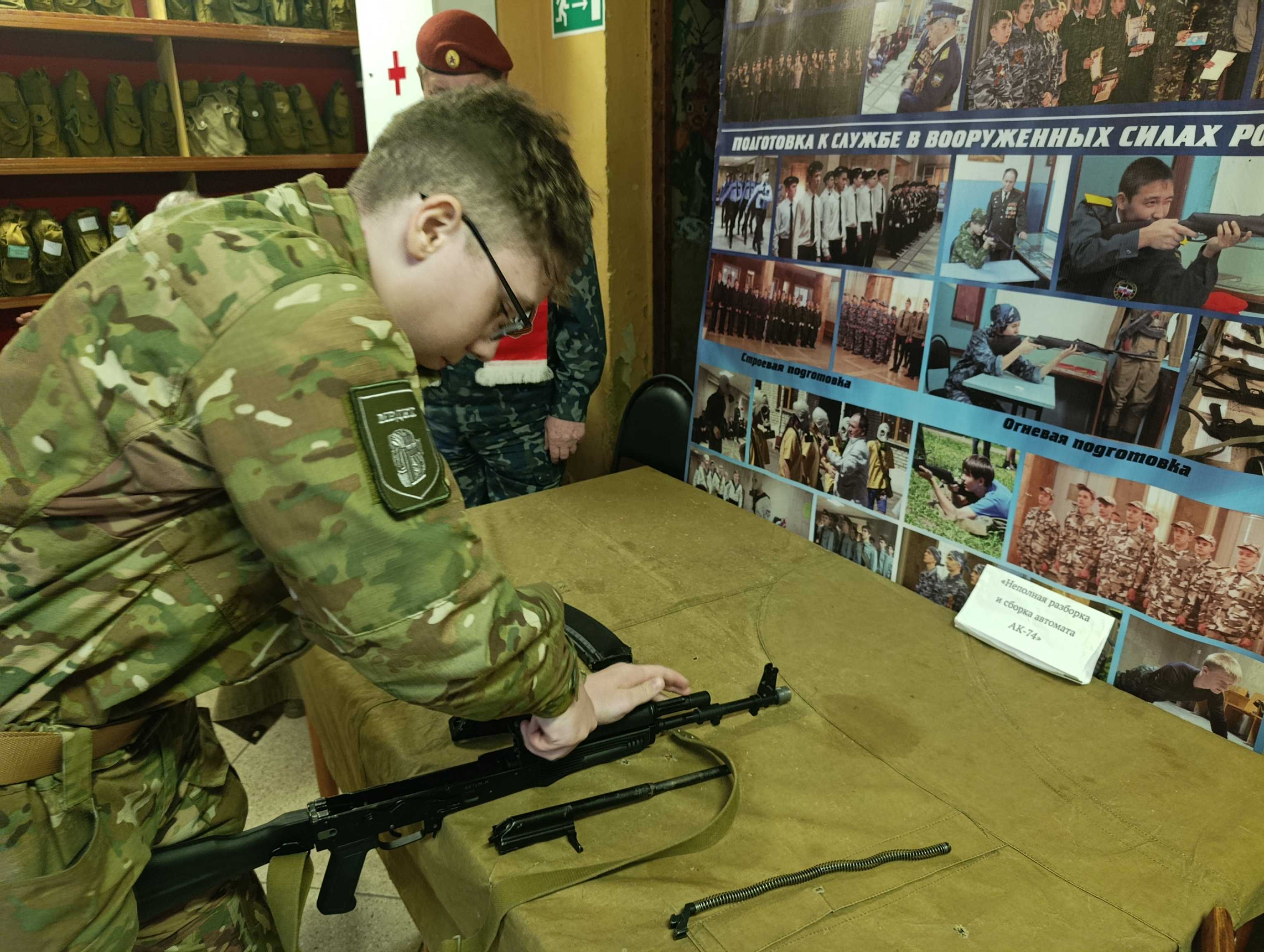 Практическая часть программы состояла из упражнений по разборке и сборке автомата АК-74, стрельбы из пневматической винтовки на точность, а также из норматива по надеванию общевойскового защитного комплекта и противогаза.