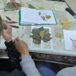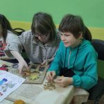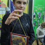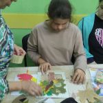 На занятии по декоративно-прикладному творчеству в инклюзивной творческой лаборатории «Дорога к счастью» ребята создавали картину «Осенний многоцвет» с использованием разнообразных осенних листьев, картона и скотча.