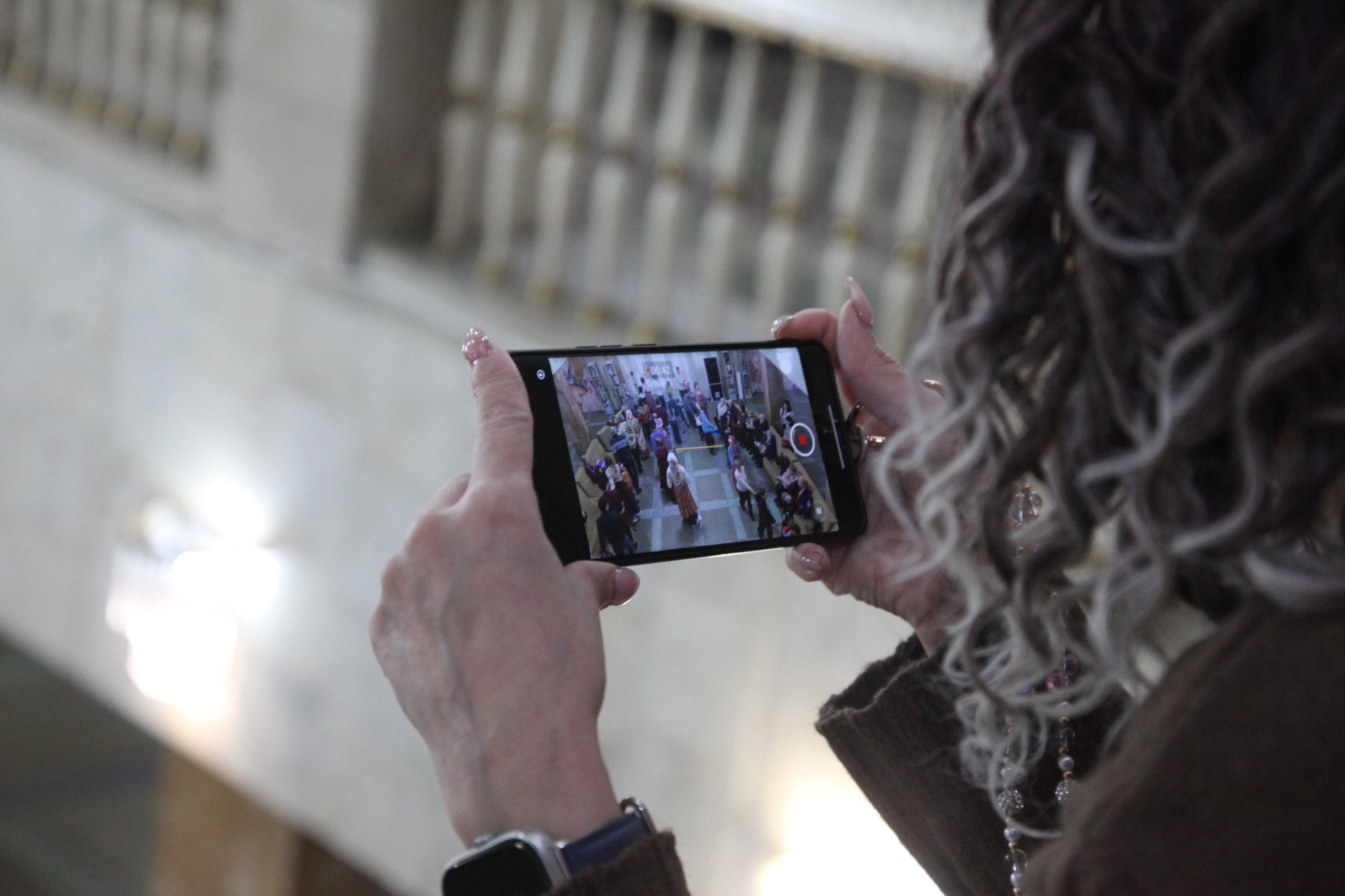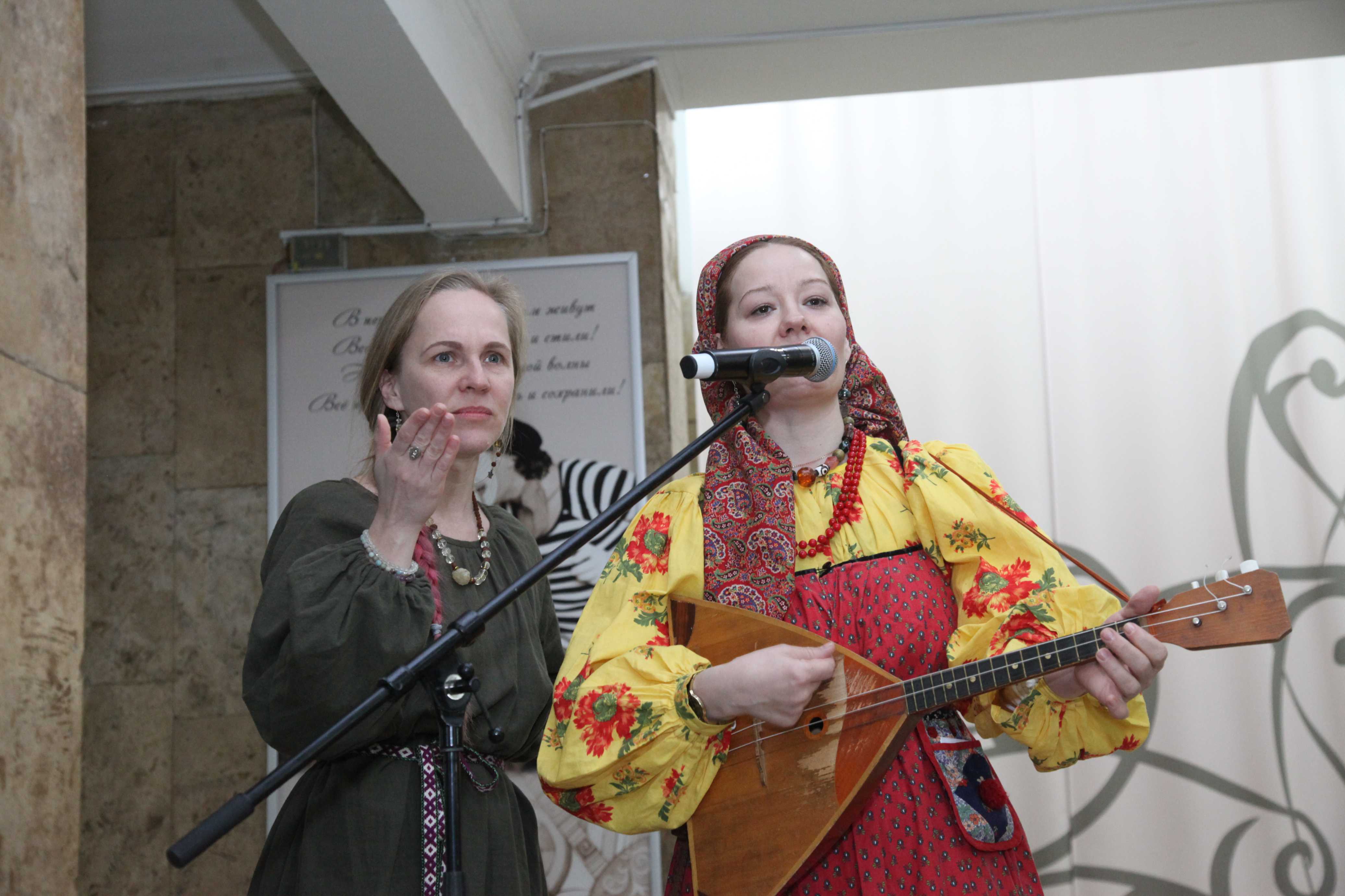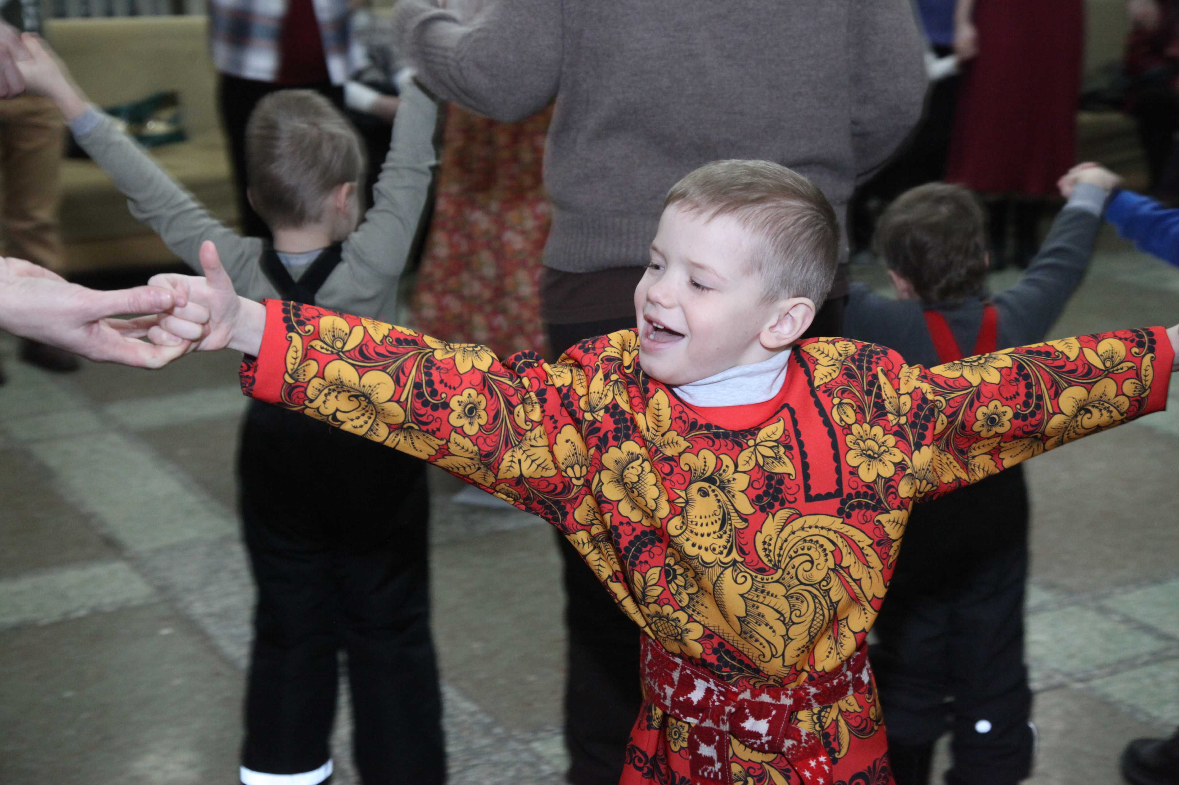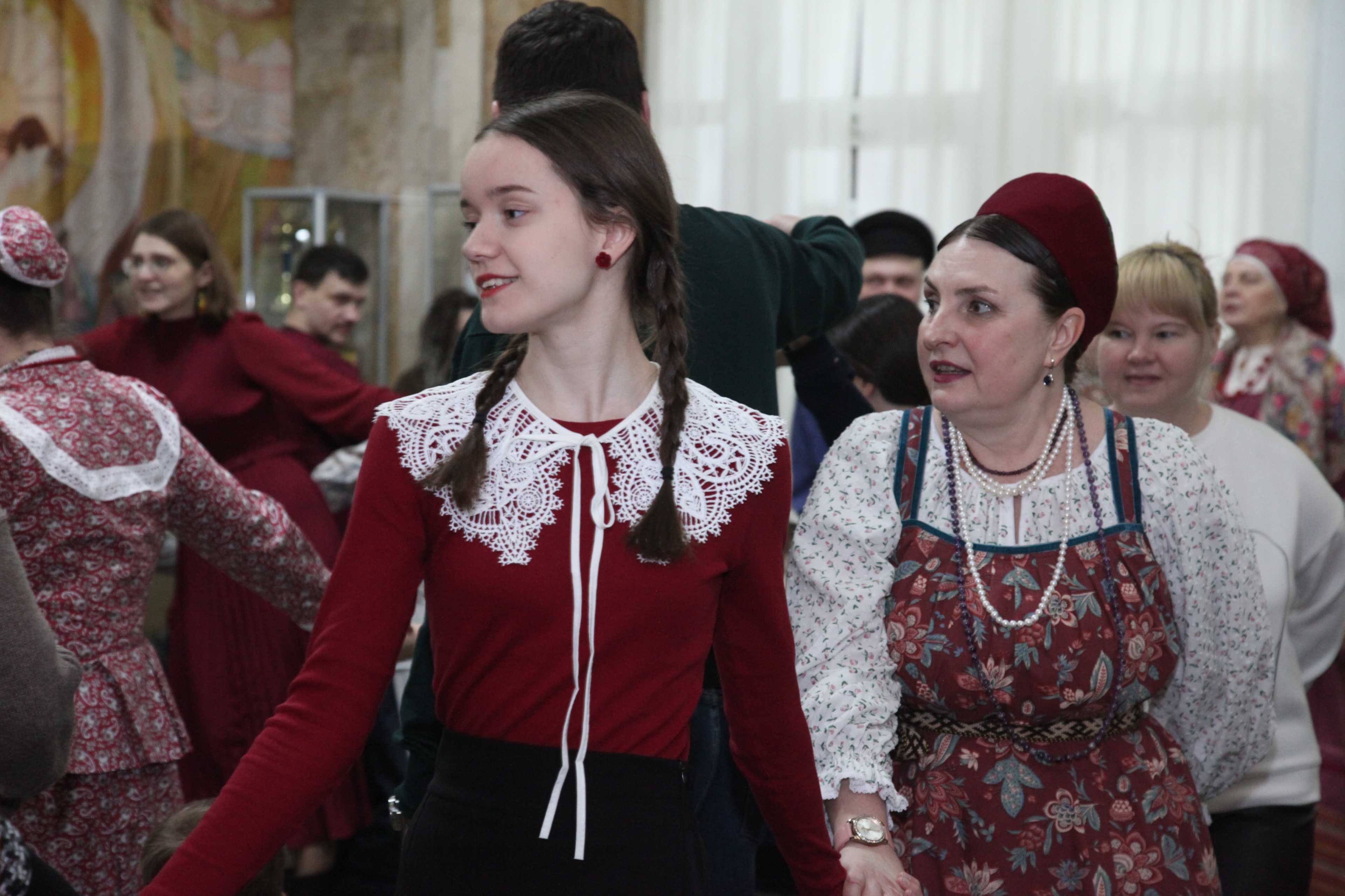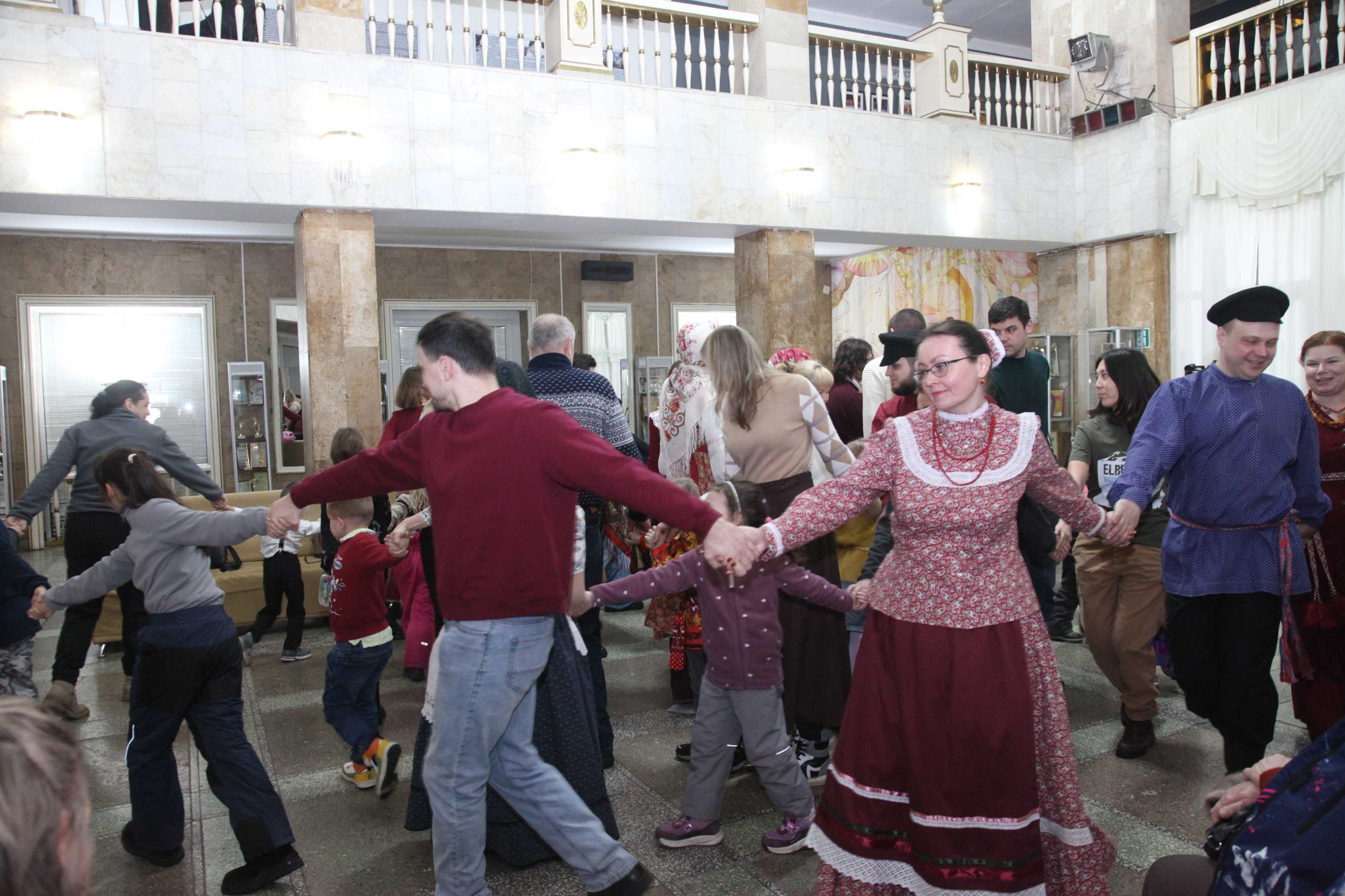 Фойе Дворца превратилось в шумную ярмарочную площадь: оно наполнилось заливистыми песнями, звонким смехом и переливами гармони. Гости всех возрастов с удовольствием водили хороводы, словно солнышко водит за собой весну, играли в старинные русские игры и состязались в ловкости.
