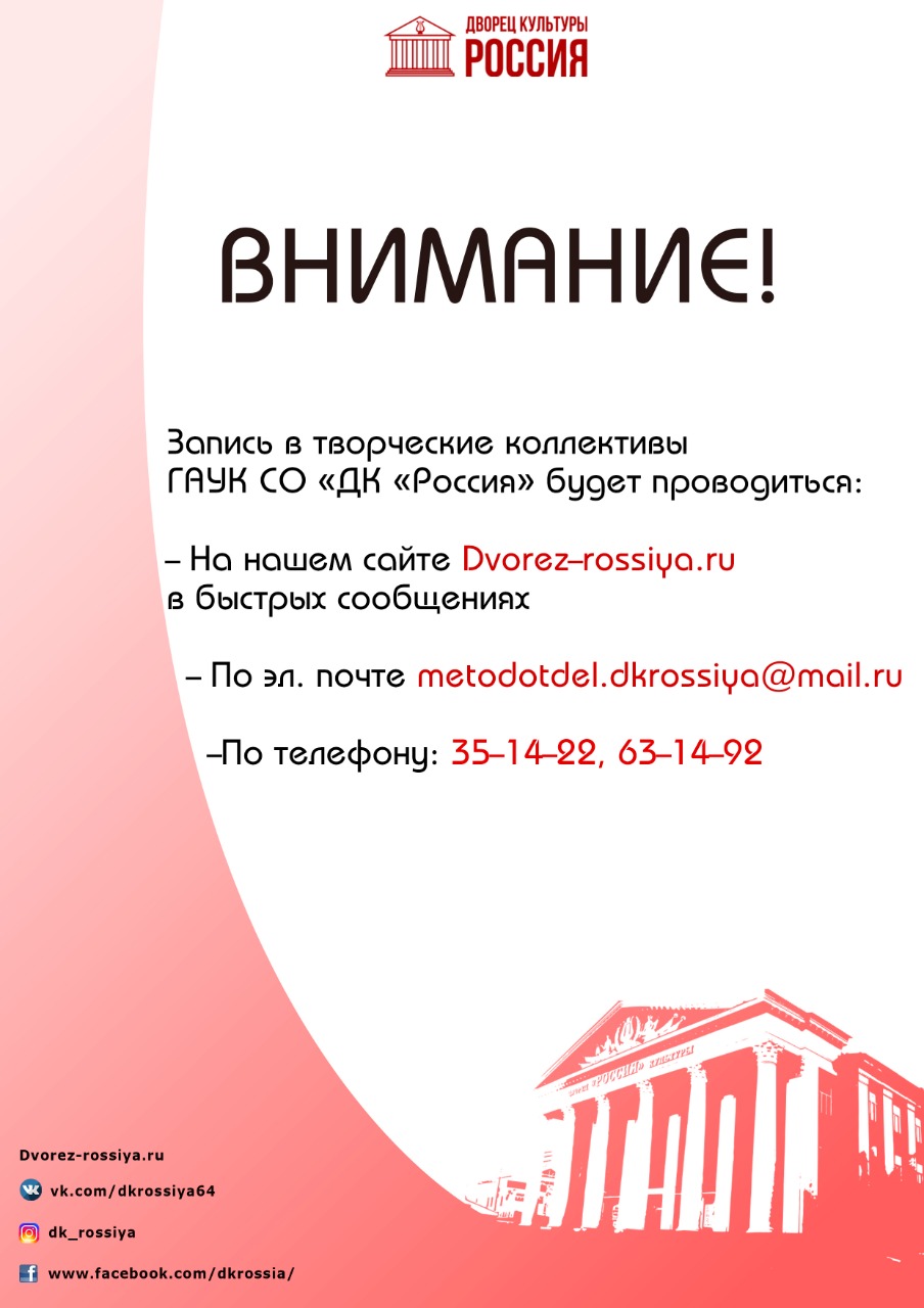 ГАУК СО ДК «Россия» открывает онлайн — запись в кружки и творческие объединения.