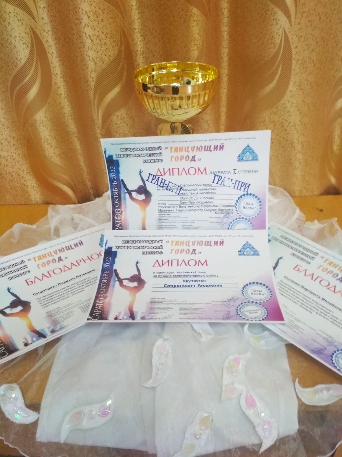 Поздравляем «Народный коллектив» театр танца «Арабеск» с получением Гран-при в Международном хореографическом конкурсе «Танцующий город» в номинации «Классический танец» с композицией Сент-Пре «Журавли». Руководителю коллектива Сапранович Людмиле Матвеевне был вручен диплом «За лучшую балетмейстерскую работу». Молодцы! «Арабеск» как всегда на высоте! Поздравляем!