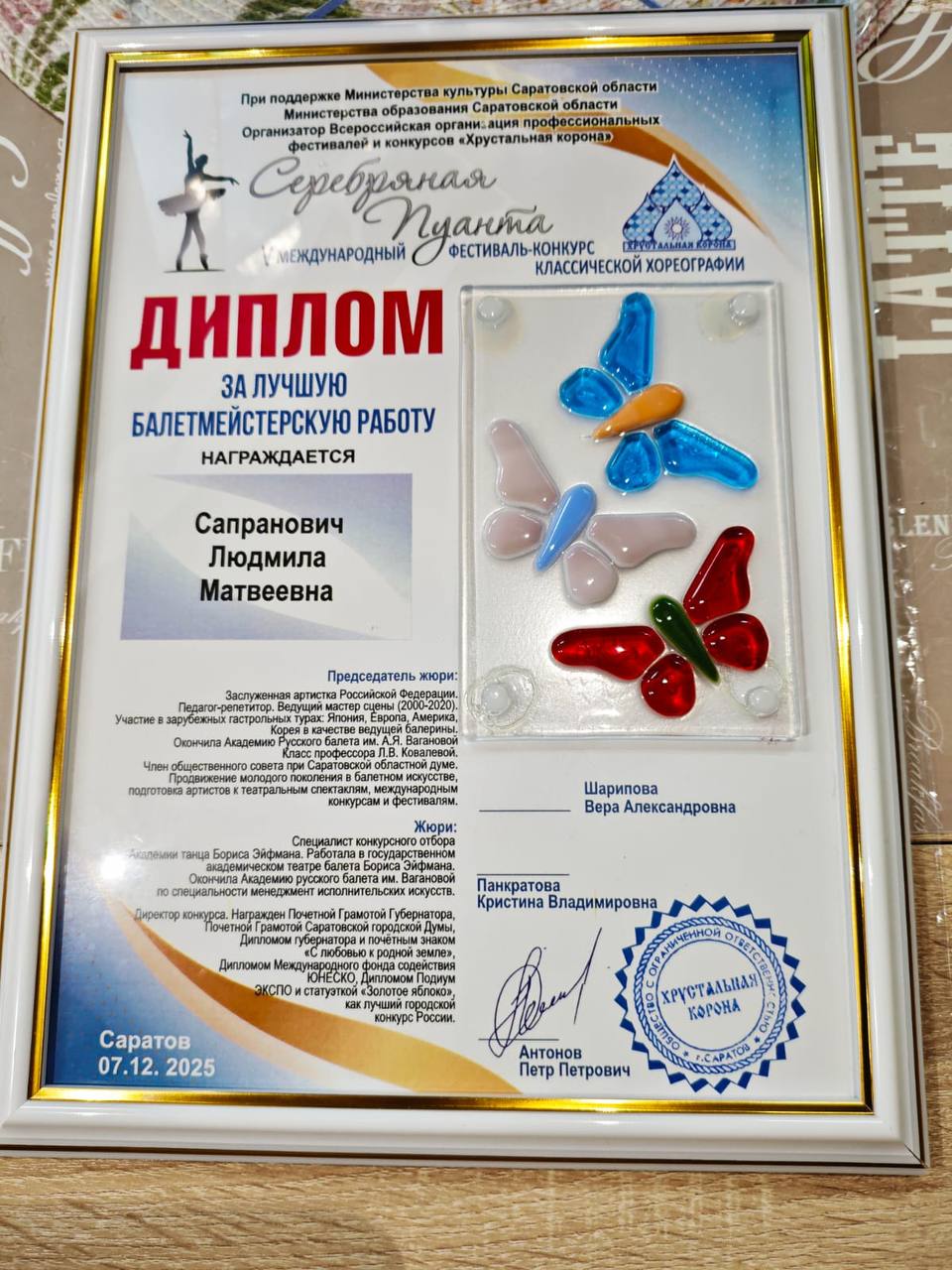 Особой наградой отмечен труд наставника. Диплом за лучшую балетмейстерскую работу получила художественный руководитель коллектива Сапранович Людмила Матвеевна.