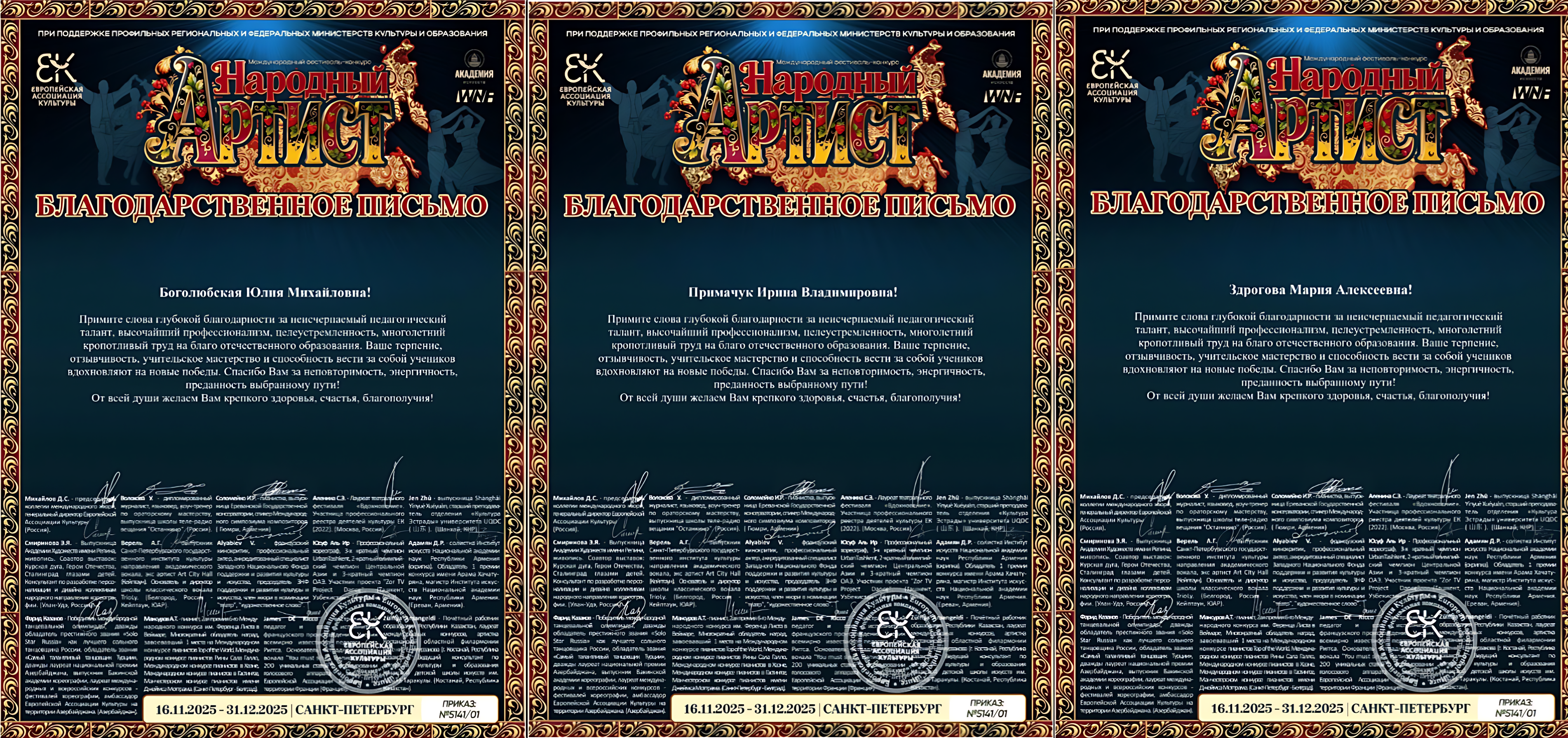 Руководитель ансамбля Ирина Владимировна Примачук и хореографы Юлия Михайловна Боголюбская и Мария Алексеевна Здрогова были награждены благодарственными письмами за неисчерпаемый педагогический талант, высочайший профессионализм, целеустремлённость и многолетний кропотливый труд на благо отечественного образования. Ваша работа — это фундамент, на котором строятся такие звёздные победы!