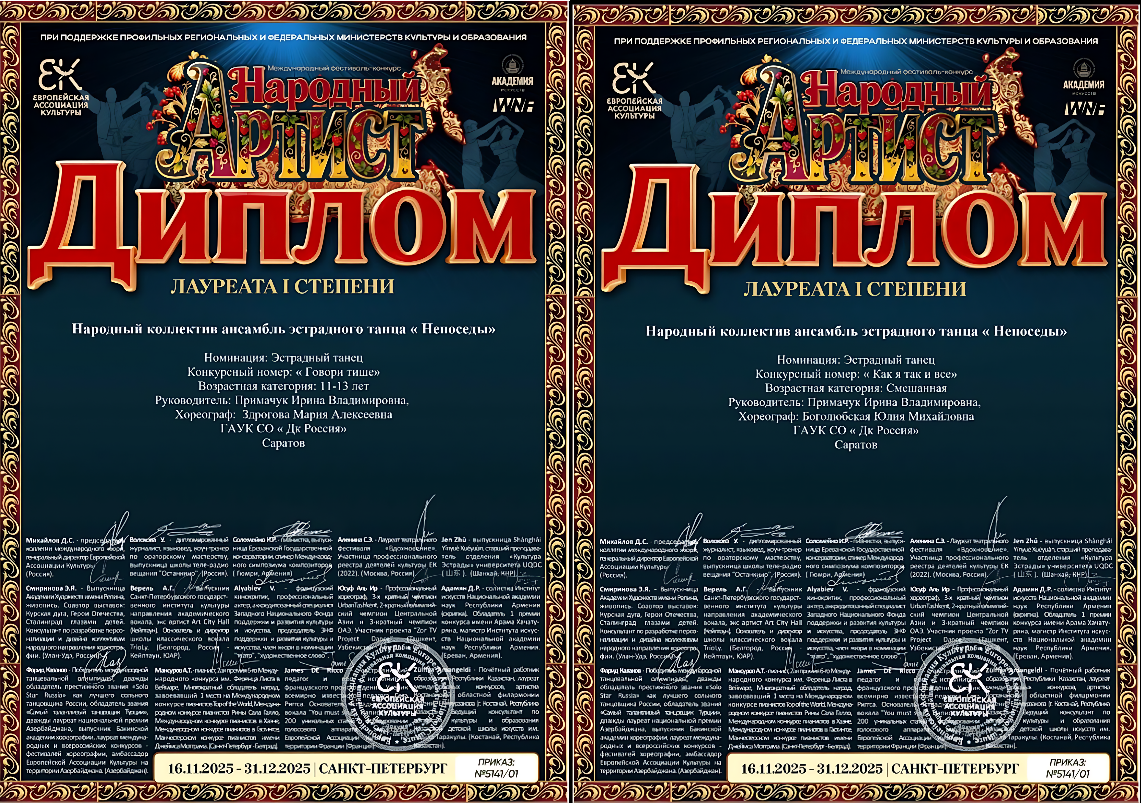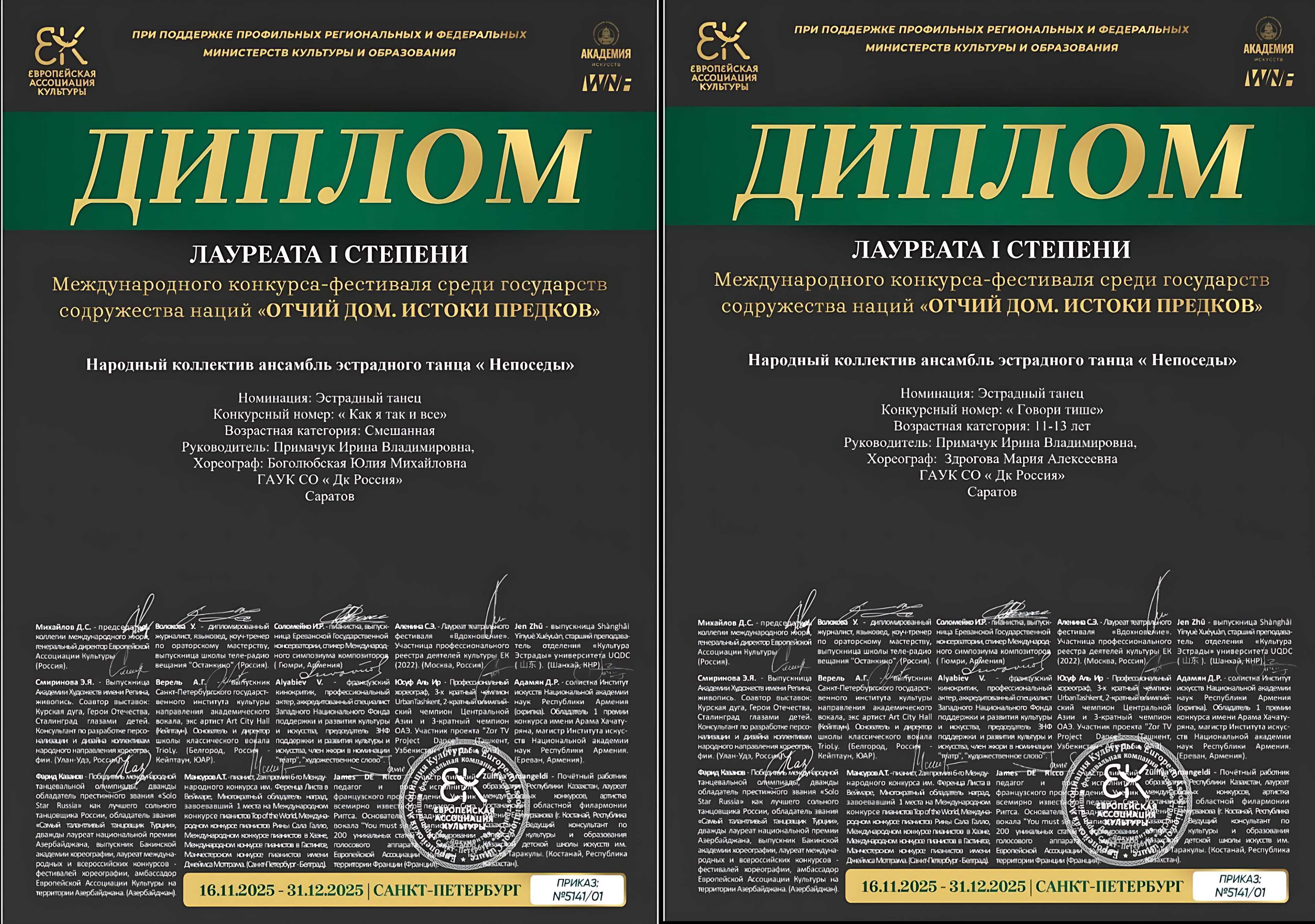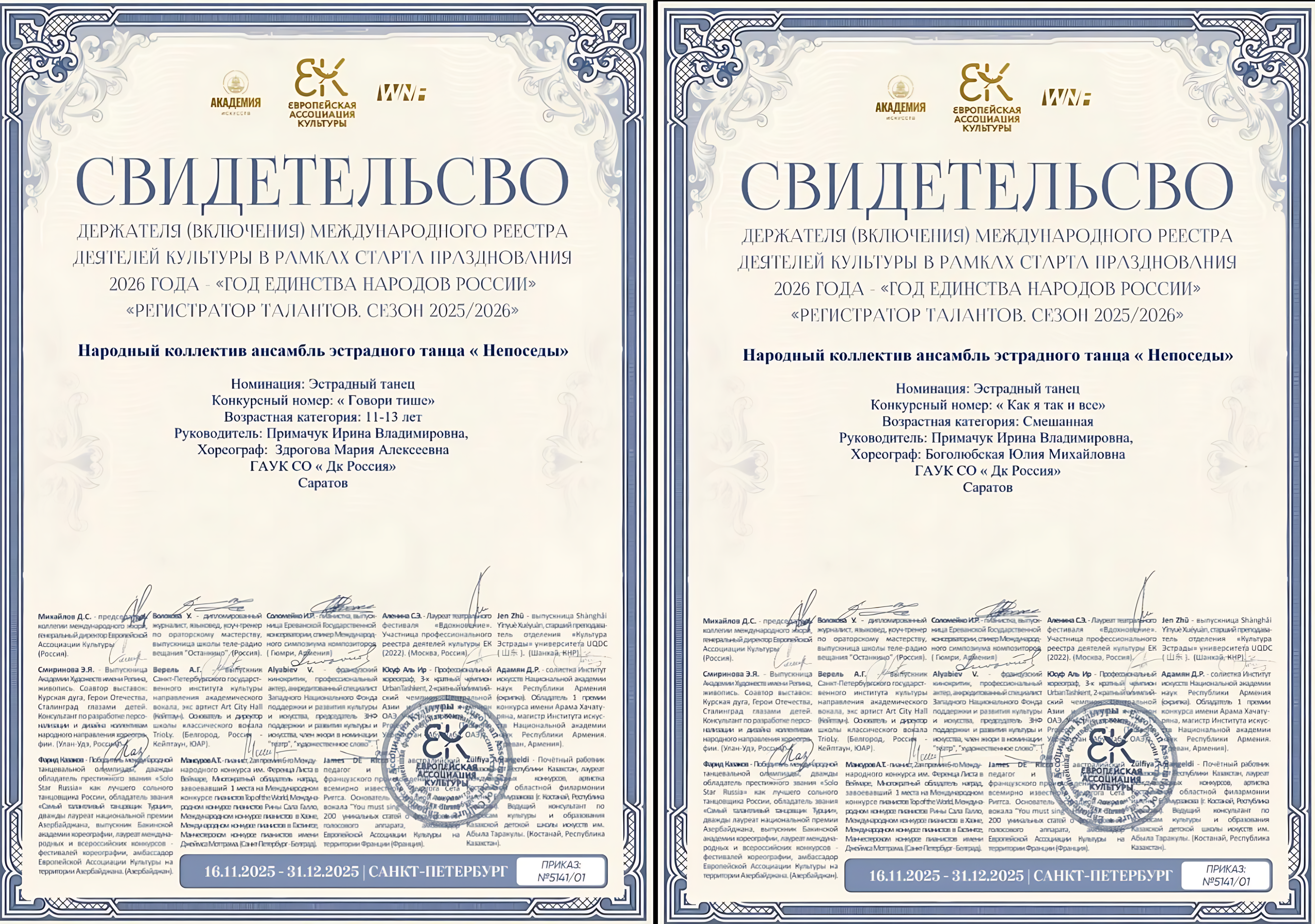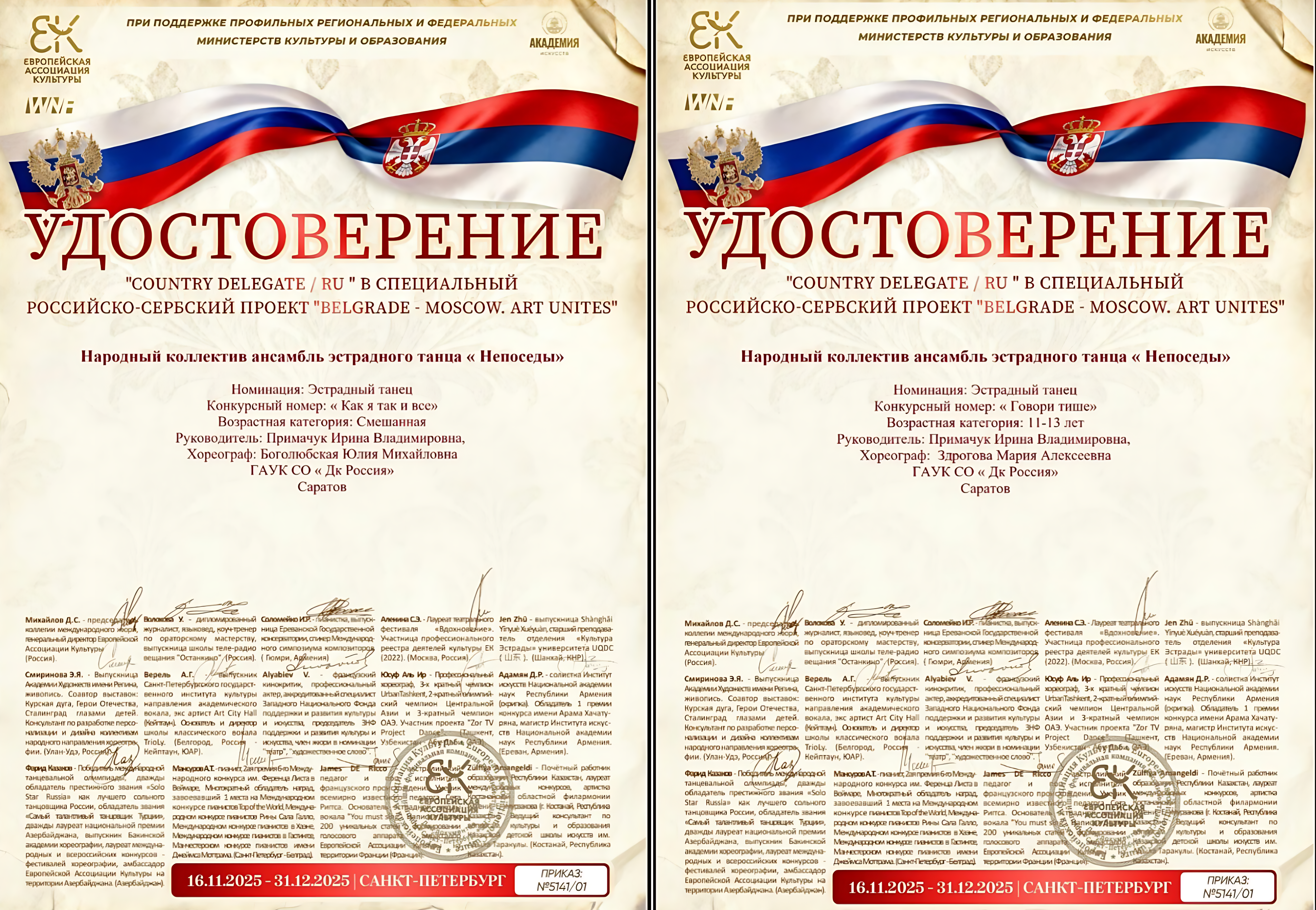 И это ещё не всё! «Непоседы» покорили сердца настолько, что были удостоены специальных дипломов! А на имя коллектива выпущено почётное удостоверение «Country Delegate/RU» для участия в специальном российско-сербском проекте «Belgrade — Moscow. Art Unites». Это признание на международном уровне и новая, захватывающая ступень в творческой биографии ансамбля!
