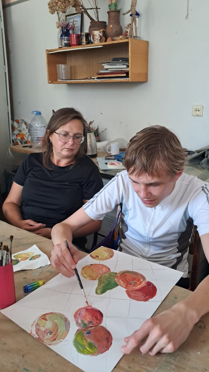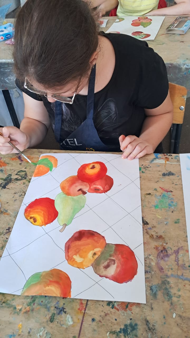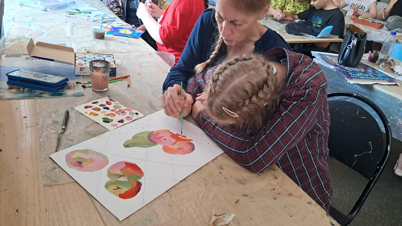 А на другом занятии творческой лаборатории, в нашей ИЗО-студии, под руководством Елены Уткиной, царила своя, фруктовая атмосфера! Юные таланты из «Дороги к счастью» взялись за кисти и краски, чтобы запечатлеть на холстах один из символов Саратовской земли — сочные хвалынские яблочки. Работы получились невероятно яркими, сочными и по-настоящему летними! Кажется, от этих картин исходит неповторимый яблочный аромат.