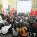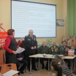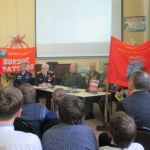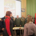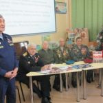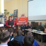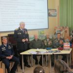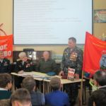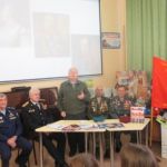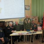 С приветственным словом к собравшимся обратился помощник депутата Саратовской городской Думы О.П.Сынкиной Александр Андреевич Рощупкин. Он поздравил всех с праздником, рассказал об областном мероприятии, посвящённом Дню героев Отечества, который состоялся во ДК Россия 9 декабря, подчеркнув, что такие героико-патриотические мероприятия воспитывают у подрастающего поколения гражданский долг, волю к победе, отвагу и мужество. Подполковник ФСБ, ветеран боевых действий на Северном Кавказе Николай Викторович Югин, член первичного отделения «БОЕВОГО БРАТСТВА» Ленинского района города Саратова поделился с ребятами своей военной биографией, заслугами пред Отечеством, выразил надежду, что и в ребятах сегодняшнего поколения живёт дух патриотизма, любви к Родине. Очень эмоциональным и патриотическим было выступление Николая Николаевича Никуленко, ветерана воздушно-десантных войск, почётного сапёра ВДВ, гвардии – полковника, руководителя военно-патриотического клуба «Отвага» ДК Россия. Николай Николаевич рассказал ребятам о своей военной службе и пригласил всех желающих на занятия патриотического клуба «Отвага» в ДК Россия. Присутствующие на мероприятии участник боевых действий на Северном Кавказе Валентин Владимирович Головушкин, старший участковый инспектор по Ленинскому району, майор Владимир Александрович Коротенко, ветеран ВДВ, мастер спорта по боксу, неоднократный чемпион ВДВ, совершивший более 1800 прыжков с парашютом Александр Иванович Филатов рассказали учащимся о своей военной службе. К мероприятию была подготовлена тематическая книжная выставка и слайдовая презентация.