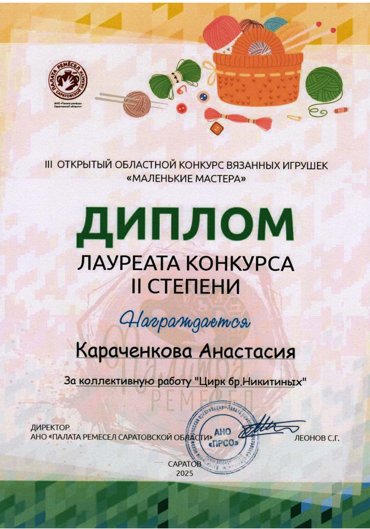 · Диплом Лауреата II степени получили – Арина Ступникова, Анастасия Караченкова и Алёна Разделкина за коллективную работу «Цирк им. братьев Никитиных».