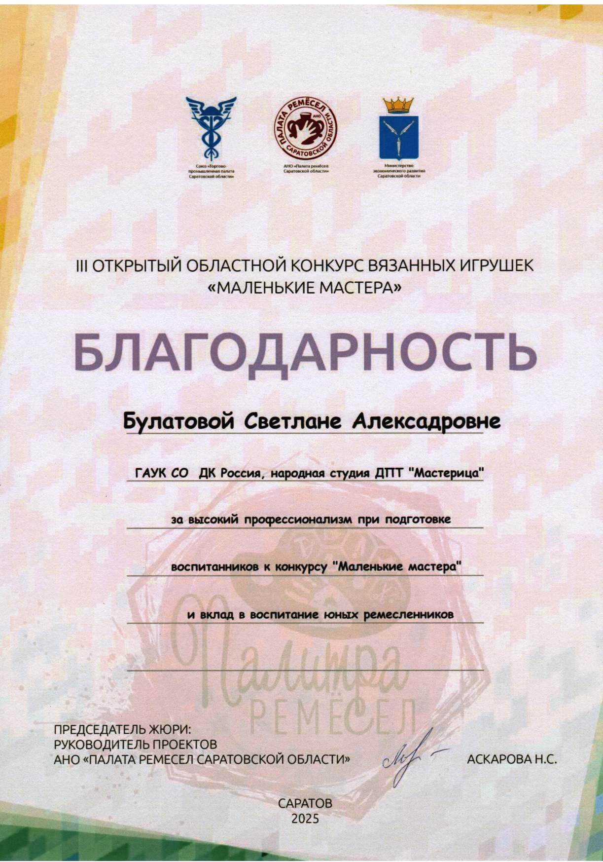 Особое место в программе занял конкурс «Маленькие мастера», посвящённый «Вязаным историям о Саратовской земле». В третий раз он собрал юных талантов, чьи руки творят настоящее волшебство. Среди них – воспитанницы «Народной студии» клуба декоративно-прикладного творчества «Мастерица» ГАУК СО ДК «Россия», которые под чутким руководством Светланы Булатовой представили удивительные работы.
