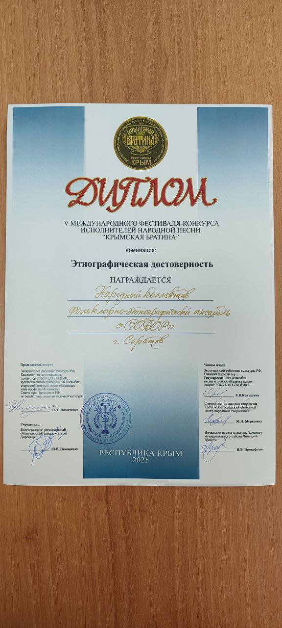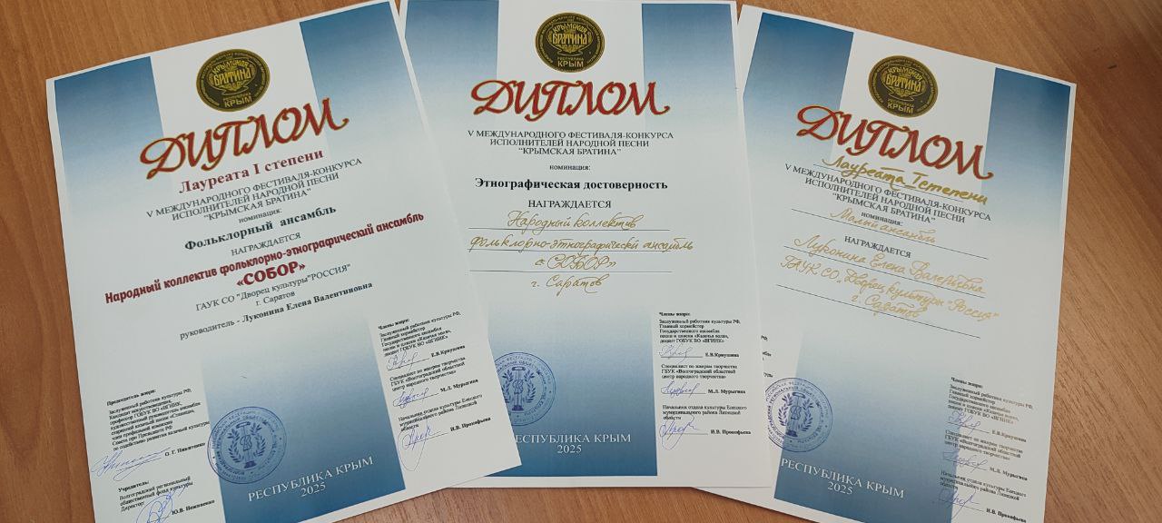 Участники саратовского коллектива получили дипломы Лауреатов I степени в номинациях «Фольклорный ансамбль» и «Малый ансамбль», а так же специальный диплом в номинации «Этнографическая достоверность».
