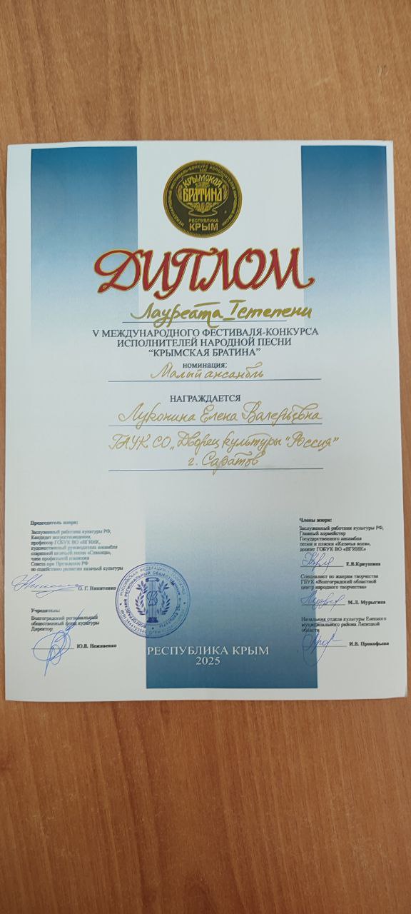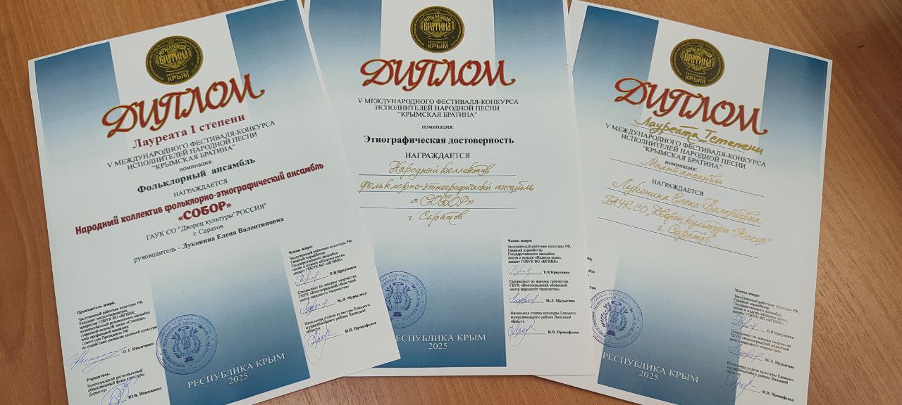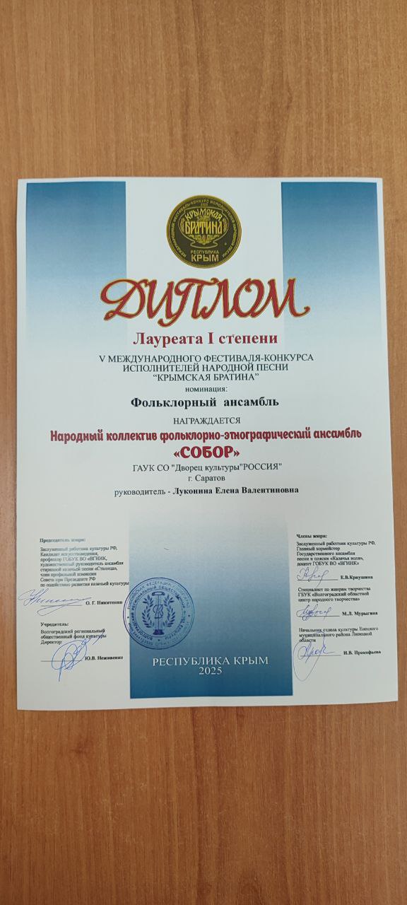 В начале июля в республике Крым, в городе Алушта, прошёл V юбилейный Международный фестиваль-конкурс исполнителей народной песни «Крымская братина». На мероприятие съехались более 250 участников со всех уголков нашей страны. Саратов представлял «Народный коллектив» фольклорно-этнографический ансамбль «Собор» под руководством Елены Лукониной (ГАУК СО «Дворец Культуры «Россия»).