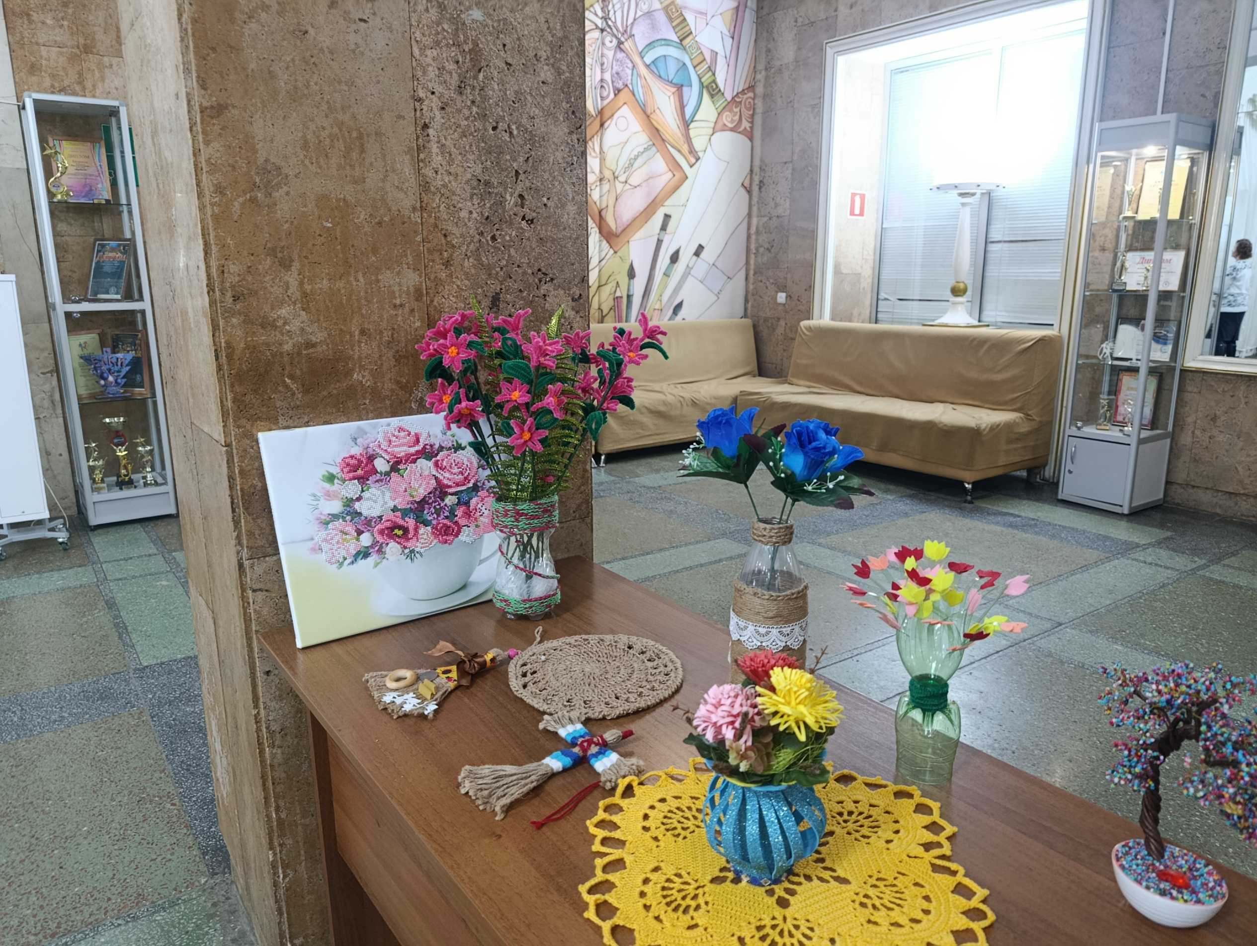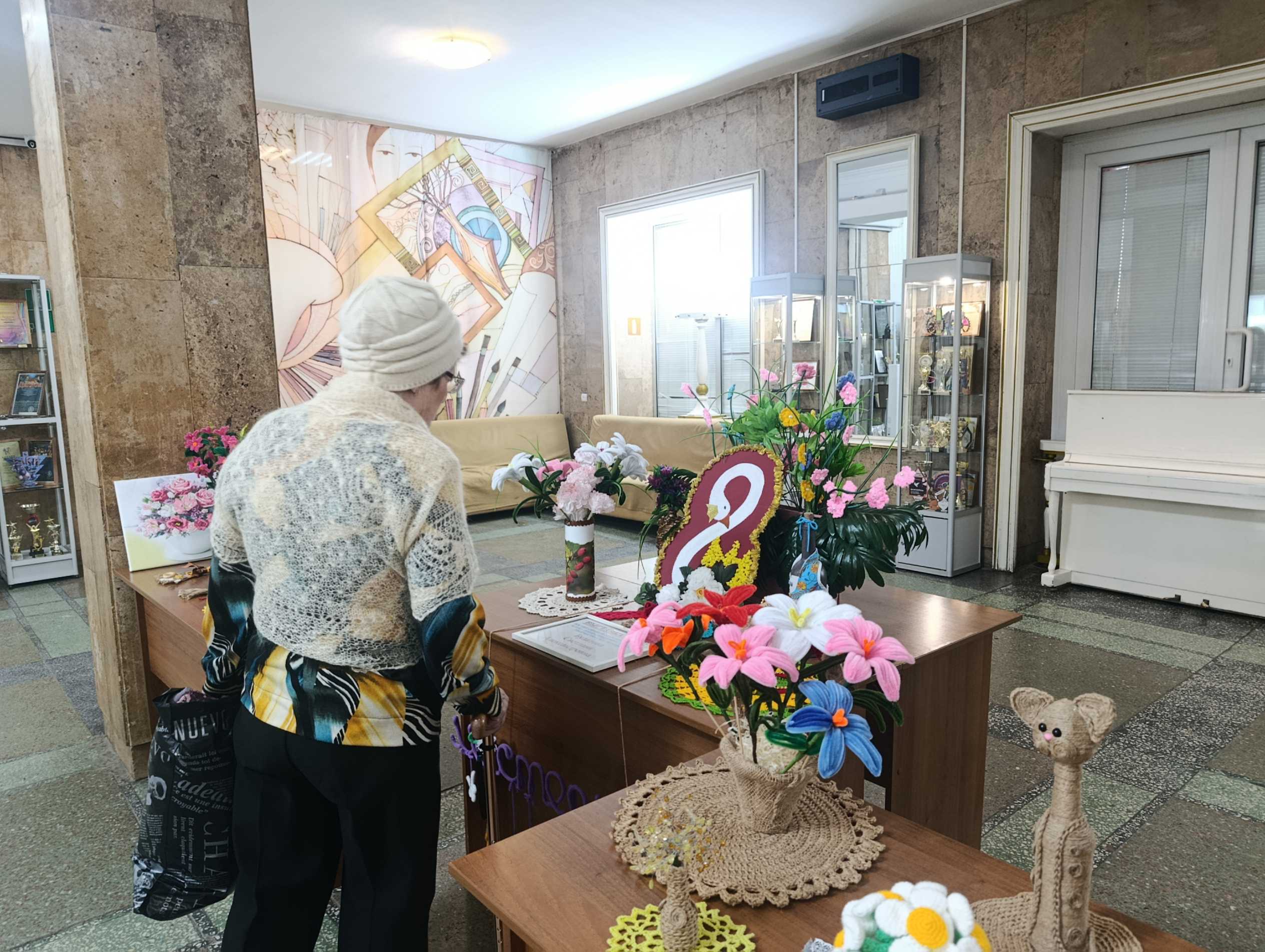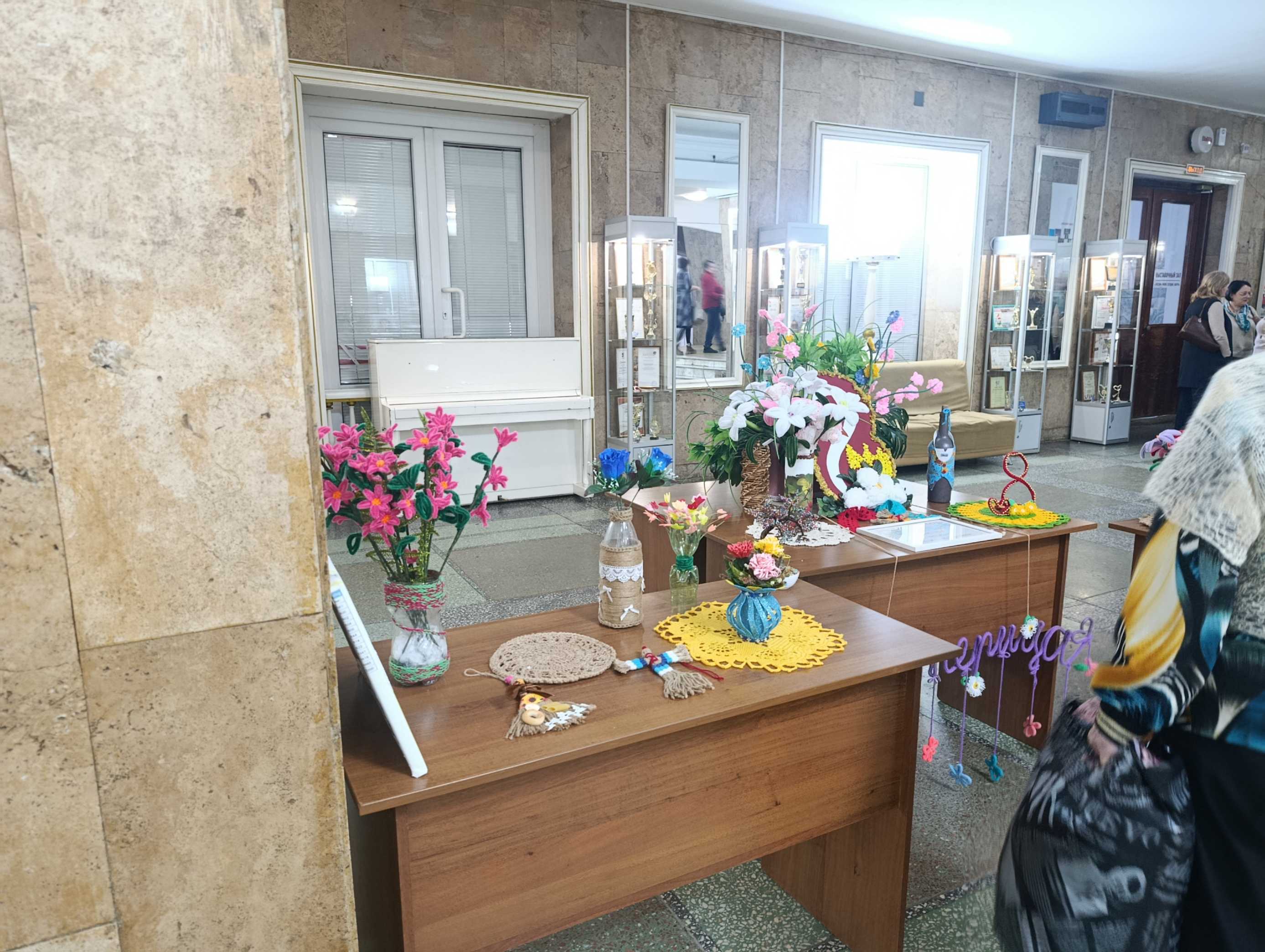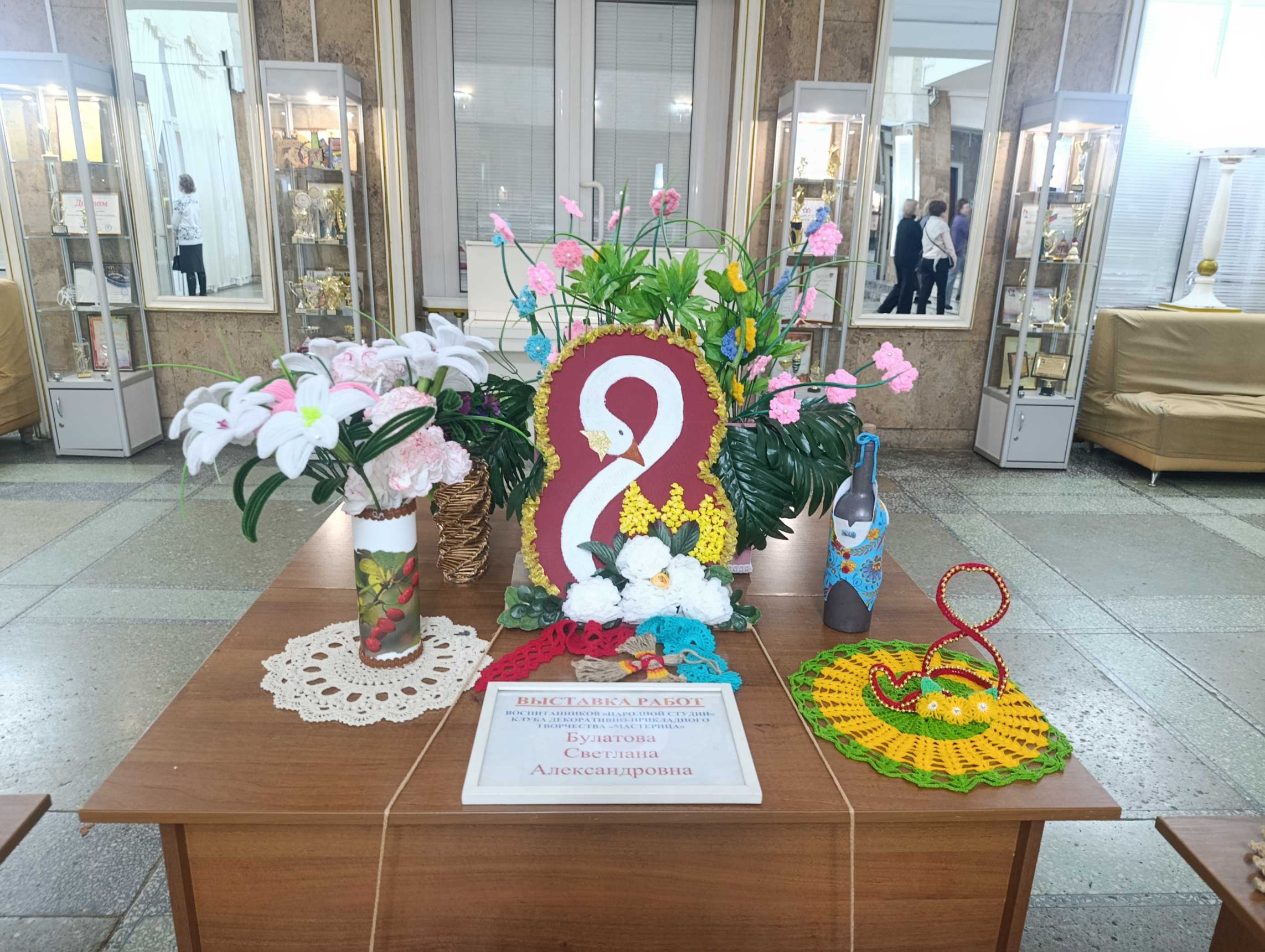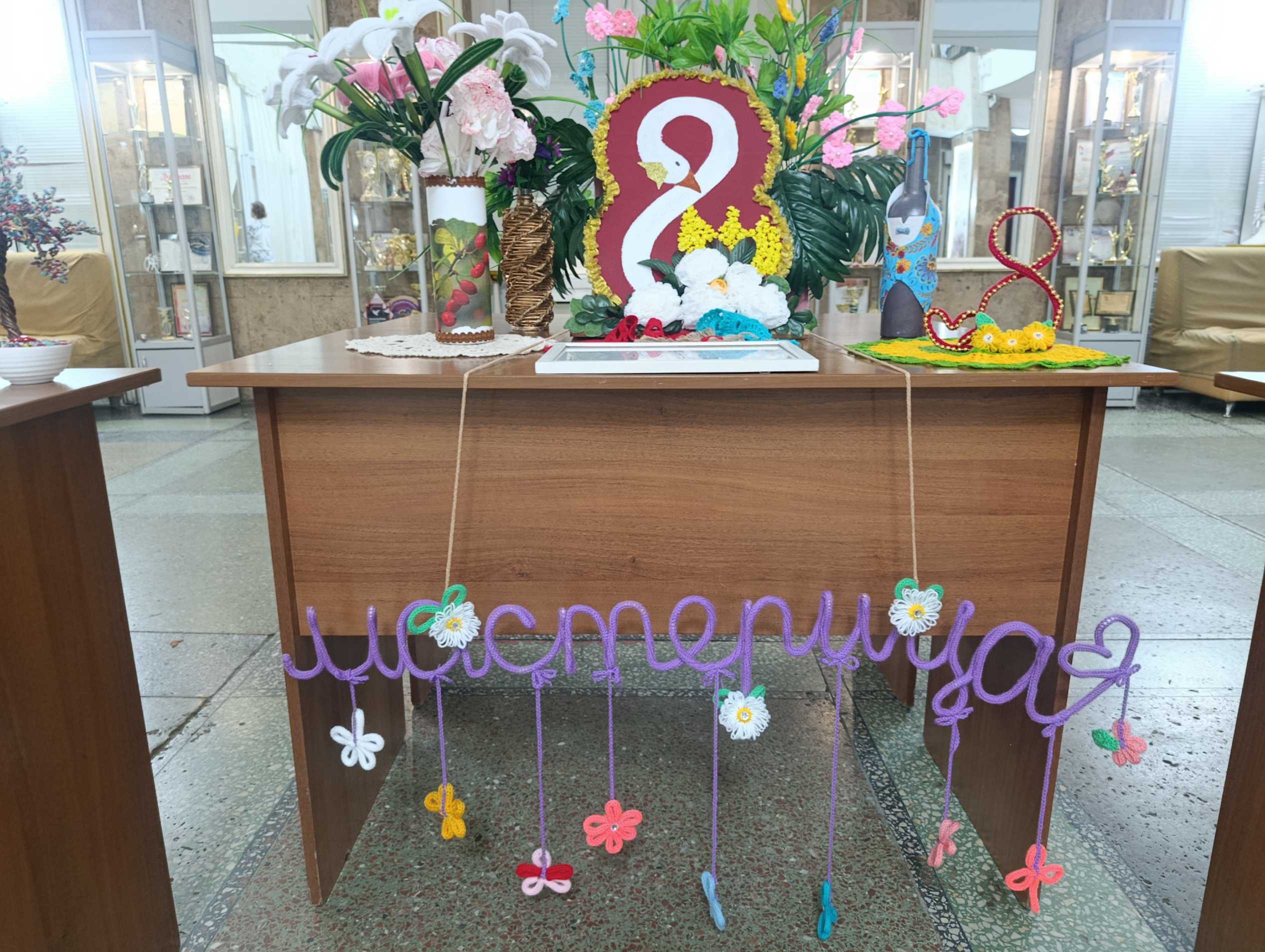 С одной стороны распустился невероятный сад: воспитанницы Народной студии клуба декоративно-прикладного творчества «Мастерица» под руководством Светланы Булатовой представили целую коллекцию весенних букетов. Тюльпаны, розы и невиданные цветы, застывшие в самых разных техниках рукоделия, словно впитали в себя солнечный свет и детское тепло. Кажется, ещё мгновение — и они наполнят воздух тонким ароматом.
