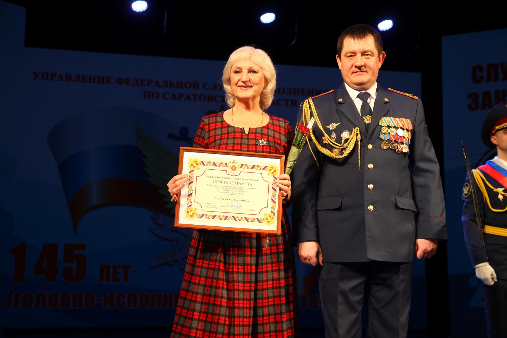 Поздравительный адрес директора ФСИН России, генерала внутренней службы Российской Федерации, Аркадия Александровича Гостева зачитал Иванов Павел Николаевич — подполковник внутренней службы в отставке, Кроме того с поздравительными словами выступили другие высокопоставленные лица: главный Федеральный инспектор аппарата полномочного представителя Президента Российской Федерации в Приволжском федеральном округе Виталий Александрович Сластной; начальник Управления Федеральной службы исполнения наказаний по Саратовской области, полковник внутренней службы Робота Александр Леонидович; генерал-лейтенант внутренней службы в отставке Леонид Григорьевич Шостак; помощник начальника Управления по работе с верующими, протоиерей Вадим Коняев; Муфтий, председатель Духовного управления мусульман Саратовской области Мукаддас хазрат Бибарсов.