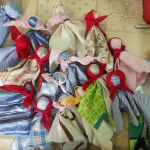 - В большой квадрат, на середину кладём любую ветошь, можно кусочек ваты, небольшой шарик, формируем головку, туго перетягивая нитками, расправляем ткань.
