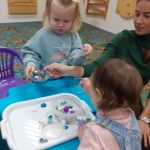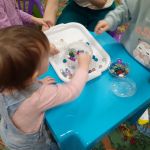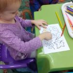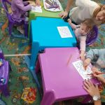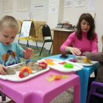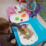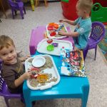 Сегодня в детской студии «Развиваемся играя» малыши играли с разноцветными камушками и раскрашивали осенние листочки. Повторили танец с листиками и построили башню. Сделали аппликацию «Колеса для машинки». А после со старшей группой ещё поиграли с песком и прочитали книжку про гонки.