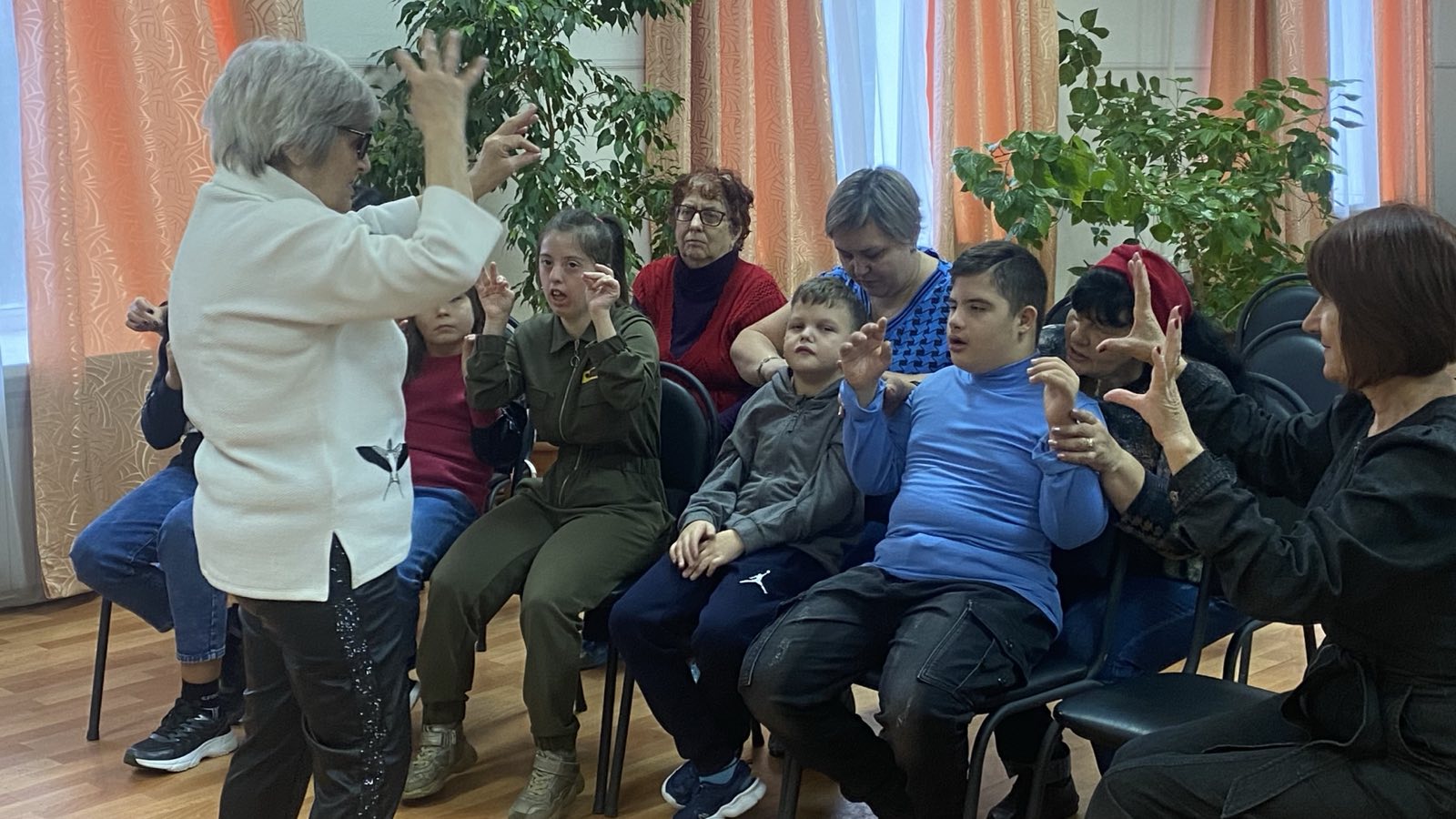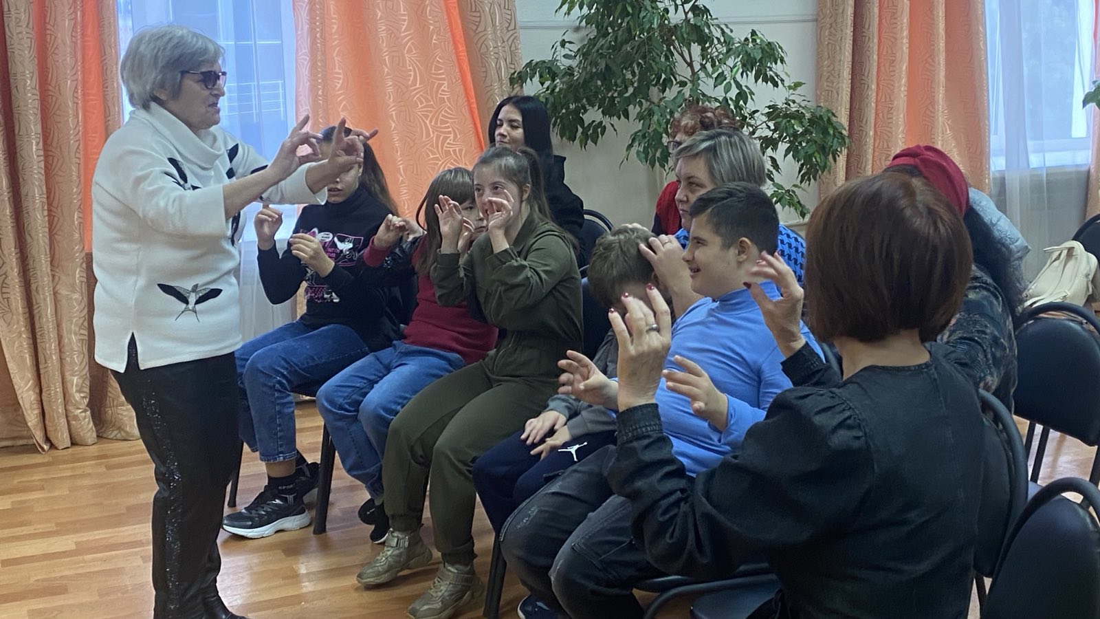 Сегодня на театральном и музыкальном занятиях, вместе с педагогами, ребята из инклюзивной творческой лаборатории “Дорога к счастью” продолжали работу со звуками и учили песенку про паровоз. К произношению звуков добавляли еще и движения.